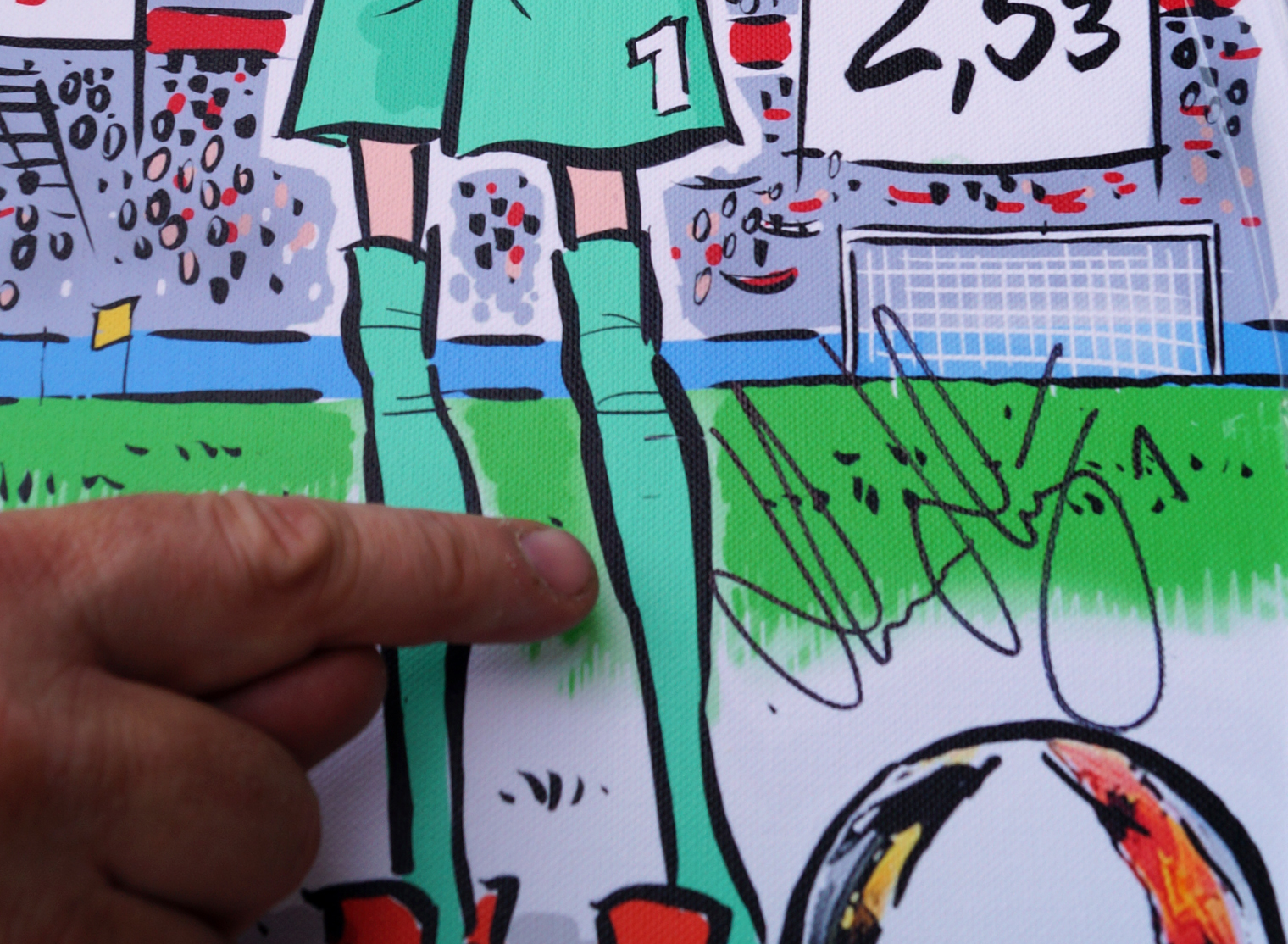 Nachdem das Original überreicht wurde, signierte der amtierende Adler der Saison 2015/16, Lukas Hradecky, ein Duplikat dieser besonderen Karikatur, welches in seinen Maßen nur wenige Zentimeter vom Original abweicht (Größe ca. 40x60cm). Dieser Leinwanddruck kann im Rahmen der Comic-Ausstellung vom 02. bis 31. August 2016 für einen guten Zweck, der Hilfe für krebskranke Kinder Frankfurt e.V., ersteigert werden. Gebote sind direkt vor Ort bei der Volksbank Darmstadt-Südhessen abzugeben. Weitere Informationen zur Veranstaltung gibt es hier.