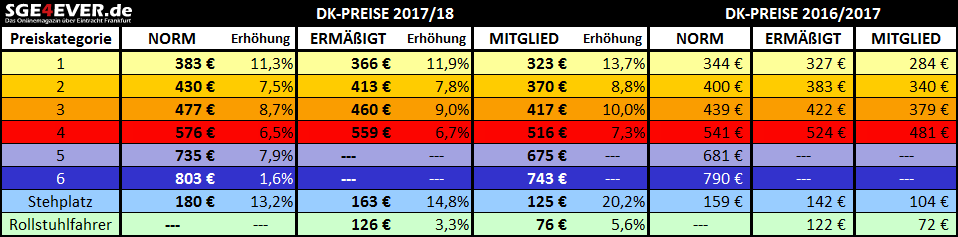 Teurere Dauerkarten: Die Eintracht hat am heutigen Dienstag die ersten Informationen zu den Dauerkarten für die kommende Saison 2017/18 herausgegeben. Aus diesen geht hervor, dass die Preise in allen Kategorien steigen werden. Im Vergleich zur aktuellen Saison teilweise sogar um mehr als 20 Prozent. Der Bereichsleiter „Zuschauerservice“, Christoph von Reisenauer, erklärte die steigenden Preise gegenüber SGE4EVER.de: „Preisstabilität war und ist uns sehr wichtig, was sich nicht zuletzt darin zeigt, dass wir letztmalig die Dauerkartenpreise zur Saison 2013/2014 erhöht haben. Natürlich müssen auch wir uns an den Preisen der anderen Bundesligisten orientieren und wir betreiben hier im Vergleich immer noch eine sehr faire und möglichst fanfreundliche Preispolitik.“ Er gab an, dass man die Preiserhöhungen durchaus kritisch diskutiert und auch einige Anregungen aus dem Fanbereich mit einfließen lassen habe. „Aber auch die Preisnachlässe auf die teuersten Kategorien zeigen, dass wir als Eintracht Frankfurt bestrebt sind, das besondere Erlebnis in der Commerzbank Arena in allen Bereichen möglichst vielen Menschen möglich machen wollen“, so von Reisenauer und zielt damit auf die Preiskategorien 5 und 6 an, die erstmals für Mitglieder vergünstigt angeboten werden und damit günstiger sein werden als der reguläre Dauerkartenpreis in 2016/17. In der nachfolgenden Übersicht können alle Preise inklusive Aufschlag eingesehen werden.