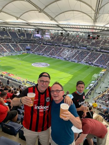 Christopher Michel, Journalist aus Bad Vilbel: „Mein persönlicher Eintracht-Moment war am 14. April 2022. Wäre ich tätowiert, dann hätte dieses Datum irgendwo auf meinem Körper ein Plätzchen gefunden. Ich habe immer davon geträumt, ein Eintracht-Pflichtspiel in Camp Nou erleben zu dürfen. Und dann ist es ein Europa-League-Viertelfinale gegen diesen stolzen und ruhmreichen Klub. Zu sehen, wie die spanischen Radioreporter neben mir immer leiser und fassungsloser wurden, nachdem Filip Kostic das 3:0 erzielte, bleibt unvergessen. Nein, damit hatte in Barcelona niemand gerechnet! Es war für den Klub vor allem eine soziale Demütigung, weil das Stadion auch auf den Rängen eingenommen wurde. Wenn plötzlich ein „Wer nicht hüpft ist Offenbacher“ lauter durch das weite Rund tönt als die Vereinshymne, dann ist alles gesagt. Die 30-minütige Feier der Spieler nach Abpfiff vor 30.000 SGE-Fans – die sich plötzlich alle wie kleine Ameisen in Bewegung setzten und unterhalb des Gästeblocks zusammenkamen – in diesem Stadion, der Diver von Oliver Glasner, die erste PK-Frage kurz nach Mitternacht… der 14. April 2022 ist ganz fest in meinem Gedächtnis verankert.“