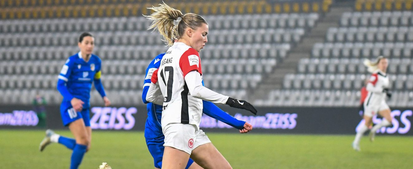 Eintracht Frankfurt Cheftrainer Niko Arnautis vertraute denselben elf Spielerinnen wie schon beim 3:0-Erfolg gegen RB Leipzig und schickte die gleiche Startelf in die Freitagabendpartie. Vor der Partie stand Carl Zeiss Jena mit nur drei Punkten abgeschlagen auf dem vorletzten Tabellenplatz. Zu Beginn war der tabellarische Unterschied der beiden Mannschaften auf dem Platz nicht wirklich spürbar. Jena startete mutig in die Partie und hatte schon nach knapp zwei Minuten durch Melina Reuter eine gute Gelegenheit, die durch SGE-Torfrau Stina Johannes allerdings vereitelt werden konnte. Es dauerte rund eine Viertelstunde bis auch die Damen der Eintracht besser ins Spiel fanden, wirklich torgefährlich wurde es allerdings nicht. In der 21. Spielminute wurde dann Elisa Senß im Strafraum am Fuß getroffen und ging zu Boden. Die Pfeife von Schiedsrichterin Angelika Söder blieb allerdings stumm – Glück für die Thüringerinnen. Nach knapp einer halben Stunde kam SGE-Topstürmerin Laura Freigang im gegnerischen Strafraum mal zu einer aussichtsreichen Kopfballchance. Der Ball ging allerdings knapp über das Gehäuse. Auch wenn die Adlerträgerinnen das Spiel immer mehr an sich rissen, münzte sich die Überlegenheit dennoch nicht in Torgefahr um. Und so blieb es zur Pause beim 0:0. Besonders bitter: Topscorerin Nicole Anyomi musste kurz vor dem Halbzeitpfiff verletzungsbedingt ausgewechselt werden. Für sie kam Carlotta Wamser ins Spiel.