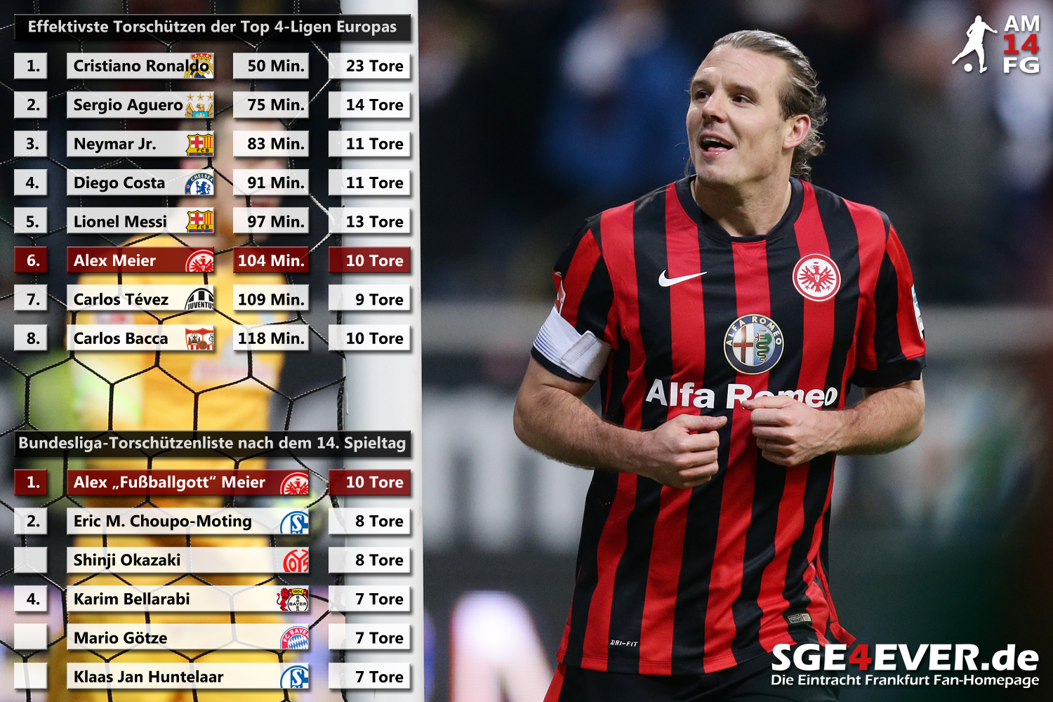 Worin das Geheimnis an seiner unglaublich starken Abschlussqualität liegt, versucht Meier in einem Interview mit der FAZ zu erklären: „Ich denke, es ist auch Instinkt. Ich laufe dorthin, wo ich meine, dass der Ball hinkommen könnte, dann versuche ich den Ball gut zu treffen, und manchmal ist er drin.“ Extraschichten nach dem offiziellen Training und mit Sicherheit auch ein Quäntchen Begabung scheinen sich auszuzahlen, denn nicht ohne Grund verzeichnet „Der Lange“ mittlerweile 92 Ligatreffer (1. und 2. Bundesliga) für die Eintracht. Wann er die 100 vollmacht, wird aber vor allem auch an seinen Teamkollegen liegen, wie Cheftrainer Thomas Schaaf erklärt: „Er ist abhängig davon, wie oft die Mannschaft ihn in Position bringt.“ Auch in der internen „Ewigen Bundesliga-Torjägerliste“ der Frankfurter liegt er auf Rang 6 (66 Tore) und kratzt damit schon am Wert von Willi Huberts (67) sowie Anthony Yeboah (68). Es deutet also alles darauf hin, dass „AM14FG“ noch in dieser Saison auf Platz 4 eben dieser vorrückt.