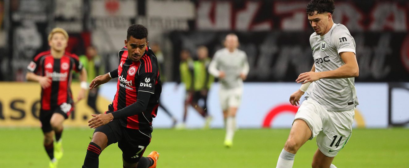 In der Art und Weise ging das Spiel auch los. Im Zuge des bundesweiten Protests gegen strengere Stadionrestriktionen verzichteten die Fans der SGE wie auch schon in Köln in den ersten 12. Minuten auf den Support. Vereinzelt waren aber Pfiffe zuhören, wenn der Ball beim VfL Wolfsburg war. Gutes Stichwort, denn der Spielfluss litt trotzdem nicht darunter. Die Eintracht war in den ersten Minuten die druckvollere Mannschaft, ohne aber zwingend vors Tor zu kommen. Auf der Gegenseite meldeten sich die Wölfe über Mohamed Amoura, dessen Hereingabe von links entscheidend von Robin Koch abgefälscht wurde (4′). Der Algerier sowie seine Mitspieler wollten einen Handspiel gesehen haben, zu Recht blieb die Pfeife des Unparteiischen, Harm Osmers, aber stumm. Koch machte damit seinen eigenen Fehler wieder gut, nachdem er zuvor das Spielgerät an Patrick Wimmer verloren hatte. Die beste Gelegenheit auf Seiten der Hessen nach elf gespielten Minuten. Jean-Matteo Bahoya trieb die Murmel mit viel Tempo nach vorne und legte auf den gut positionierten Mario Götze auf. Der Routinier zog mit einer guten Bewegung nach innen und bugsierte die Kugel knapp am langen Pfosten vorbei. Dann kam sie, die herausragende Stimmung nach zwölf Zeigerumdrehungen. Zunächst legten die wenig mitgereisten Wolfsburg-Anhänger los, die aber schnell von den Heimfans der SGE übertroffen wurden. Jetzt machte auch das Zuschauen mehr Spaß, was sich auch auf das Spiel übertrug. Allerdings waren es die Gäste aus Niedersachsen, die mal wieder mehr oder weniger gefährlich vor den Kasten der Hessen kam. Eine Hereingabe von Linksverteidiger Zehnter setzte Christian Eriksen aber deutlich über das Gehäuse (15′). Keine Gefahr. Dann war es wieder die Eintracht, die nach Ballbehauptung im Mittelfeld sich dem Tor von Grabara annäherte. Kristensens flache Flanke in die Gefahrenzone konnte zunächst geklärt werden, landete aber bei Ellyess Skhiri, der per Direktabnahme aber komplett verzog (18′). Auf der Gegenseite sind es wieder die Wölfe, die über die außen, diesmal über rechts, für Torgefahr sorgten. Amouras Flanke landete beim am langen Pfosten positionierten Zehnter, der es direkt probierte aber die Kugel nicht richtig traf und erfolglos blieb (20′). Dann hatte auch der VfL die beste Chance, eine halbhohe Hereingabe von Eriksen von rechts fand den eingelaufenen und freistehenden Amoura. Vor Zetterer setzte der Angreifer seinen Lupfer jedoch zu hoch an und verpasste damit knapp die Führung (22′).