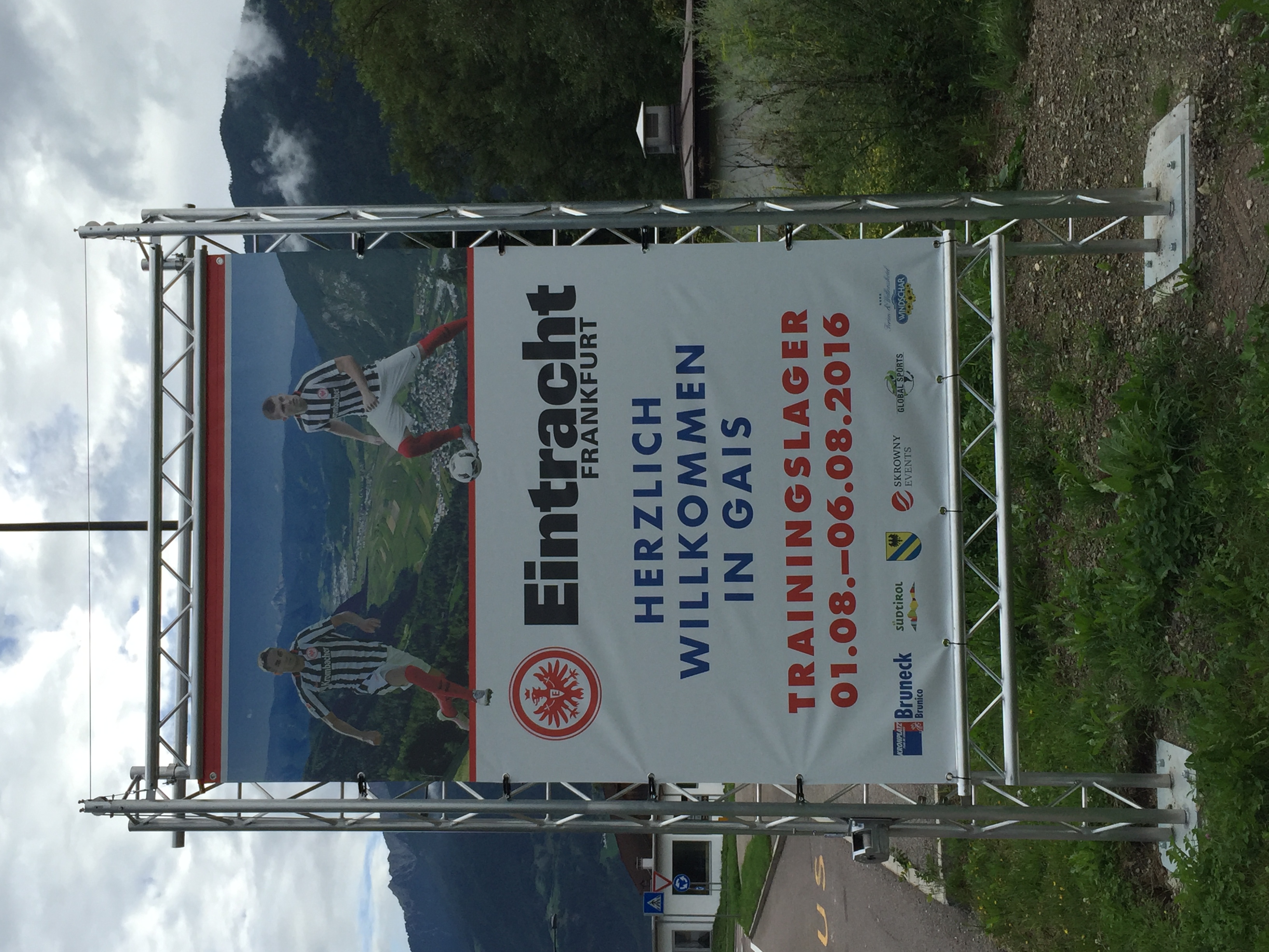 Und ja, umgeben vom Bergpanorama mit immer mal wieder vereinzelten Kühen auf der Weide am Straßenrand, bekam sogar der Dauerregen, der unentwegt aufs Auto prasselte, etwas Romantisches. Und auch die Ankunft in Gais – die anvisierte Uhrzeit wurde übrigens um ganze zwei Stunden nach hinten verfehlt – war etwas für Romantiker. Für Fußballromatiker und für alle, die die Eintracht liebhaben: Am Ortseingang von Gais steht direkt ein großes, unübersehbares Willkommens-Banner extra für die Mannschaft, die heute im Laufe des Tages eintreffen wird. Spätestens dann wird es vorbei sein mit aller vermeintlichen Romantik. Denn dieses Wort hat im harten Alltag Bundesliga nichts verloren und taucht bei den beiden täglichen Trainingseinheiten sicherlich auch nicht im Wortschatz von Niko Kovac auf.