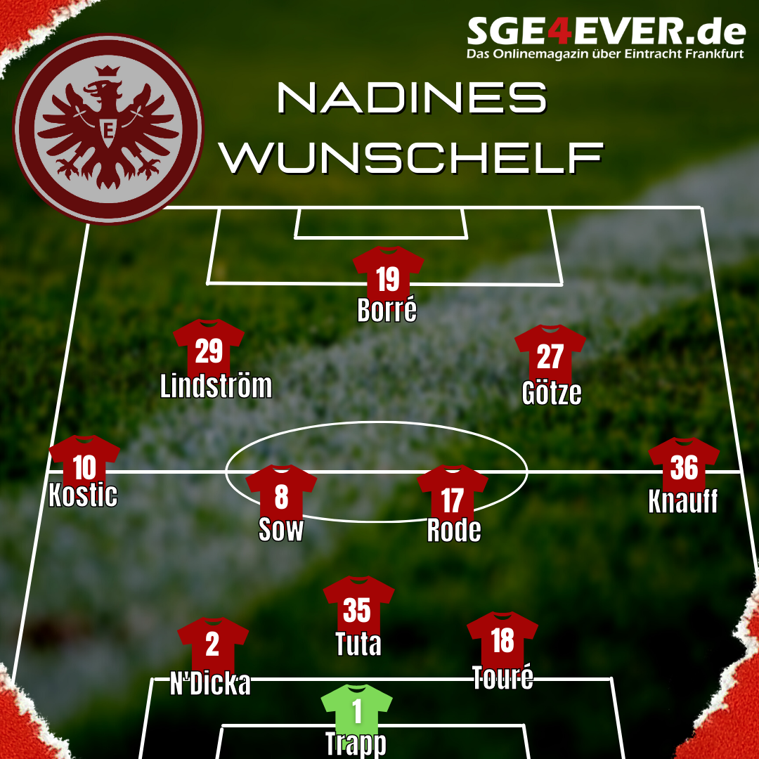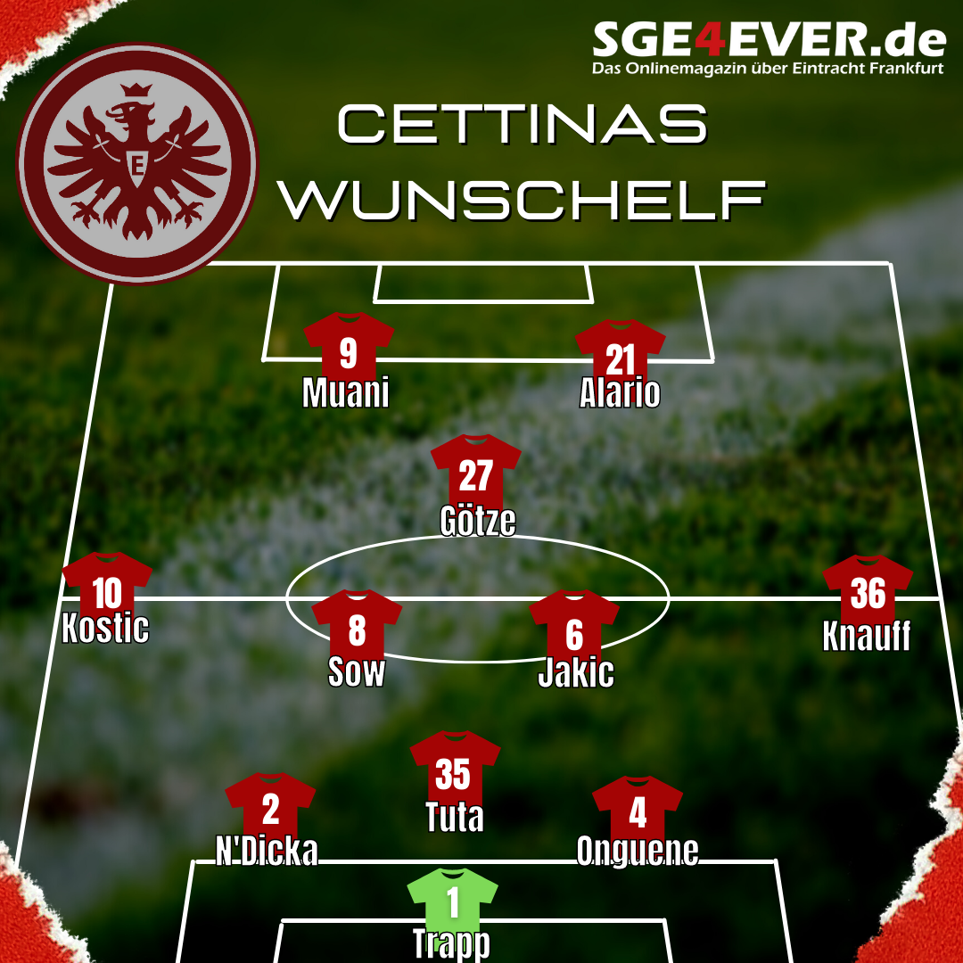 Onguene wird seine Stärken und Erfahrung in Europa League und Champions League einbringen und die Defensive neben N’Dicka und Tuta verstärken. Das Mittelfeld mit Götze, Sow und Jakic ist kreativ und kampfstark, falls Jakic nicht spielen kann sollte Rode kommen um das körperliche reinzubringen. Im Sturm Kolo Muani und Alario als vollkommen unterschiedliche Stürmertypen, Alario kennt die Bundesliga sehr gut und könnte als typischer Knipser fungieren, während RKM die Bälle festmacht und all seine Attribute wie diese unfassbare Geschwindigkeit nutzen kann.
