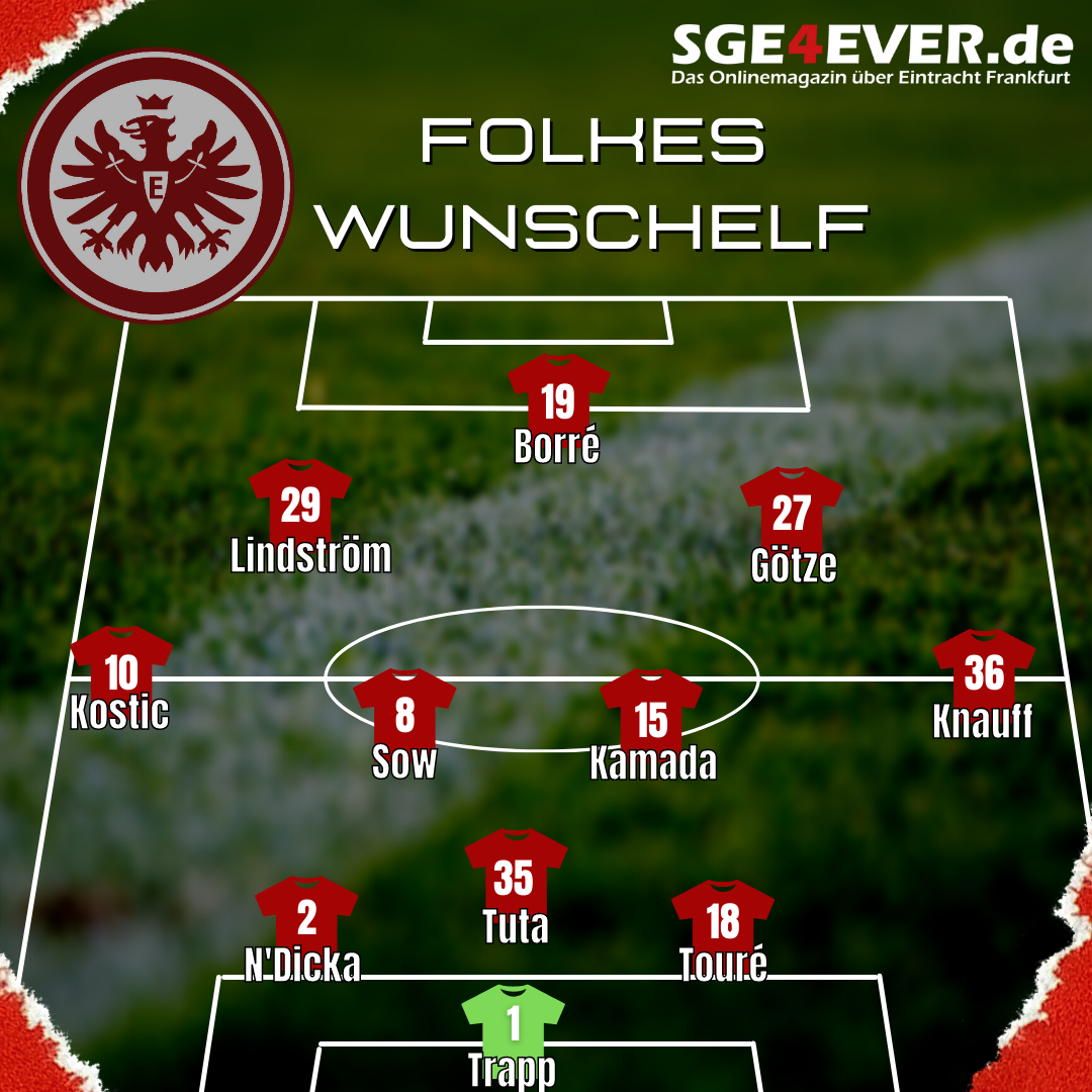 Viele Spieler stellen sich von selbst auf: Trapp, Kostic, Knauff. Bewusst habe ich mich allerdings für Makoto Hasebe entschieden, wohl wissend, dass er jemand ist, der nicht mehr jedes Spiel 90 Minuten durchspielen kann. Aber er ist hinten eine Bank und für mich, wenn er spielt, der klare Abwehrchef. Mit N’Dicka und Tuta fahren wir das beste auf, was wir im Kader haben. Kamada und Sow stellen die Doppel-Sechs, wobei Kamada zuletzt zeigte, dass er für offensiven Wirbel sorgen kann. Götze und Lindström besorgen den letzten Pass. Und Kolo Muani gehört die Zukunft, deshalb habe ich mich für ihn statt für Alario oder Borré im Sturmzentrum entschieden.