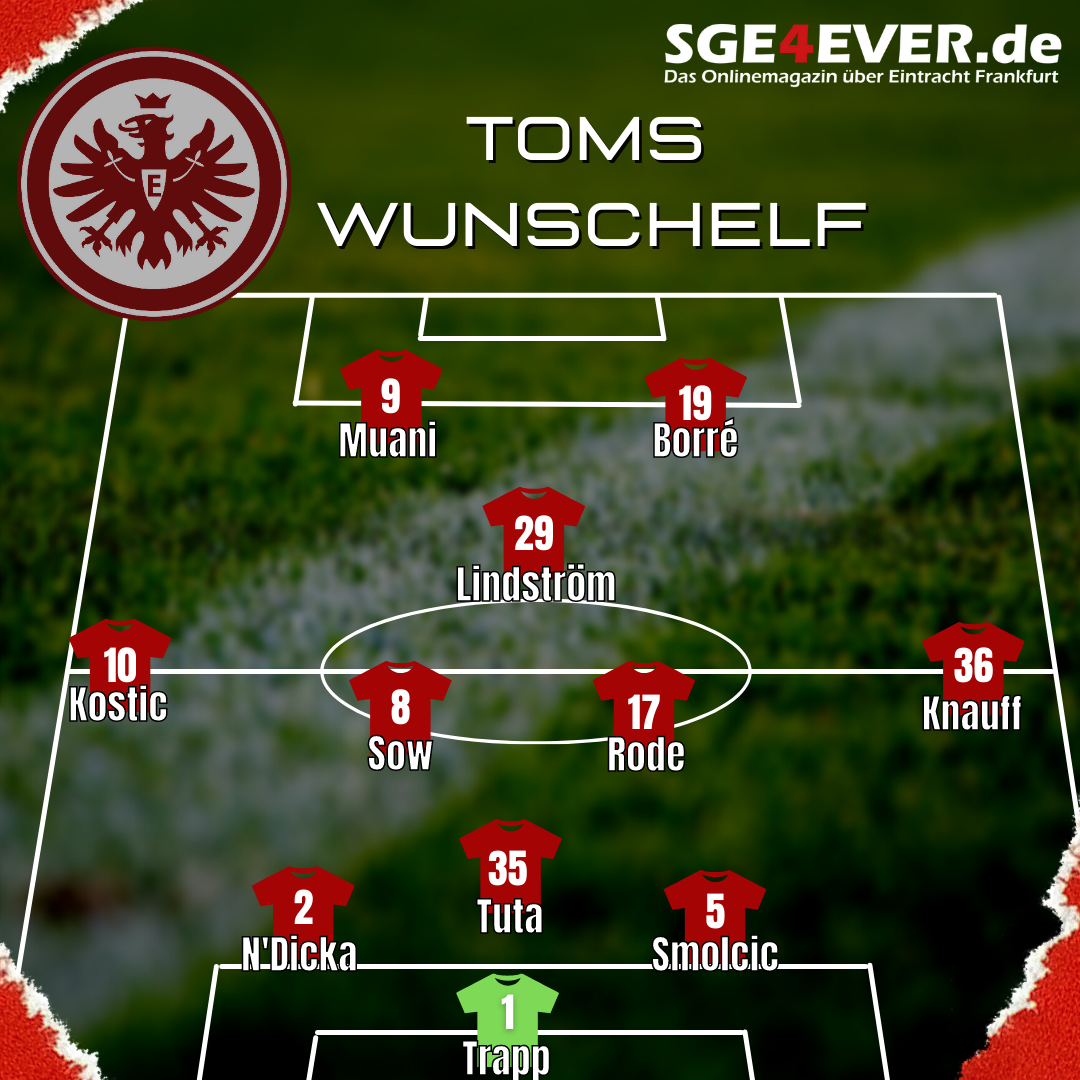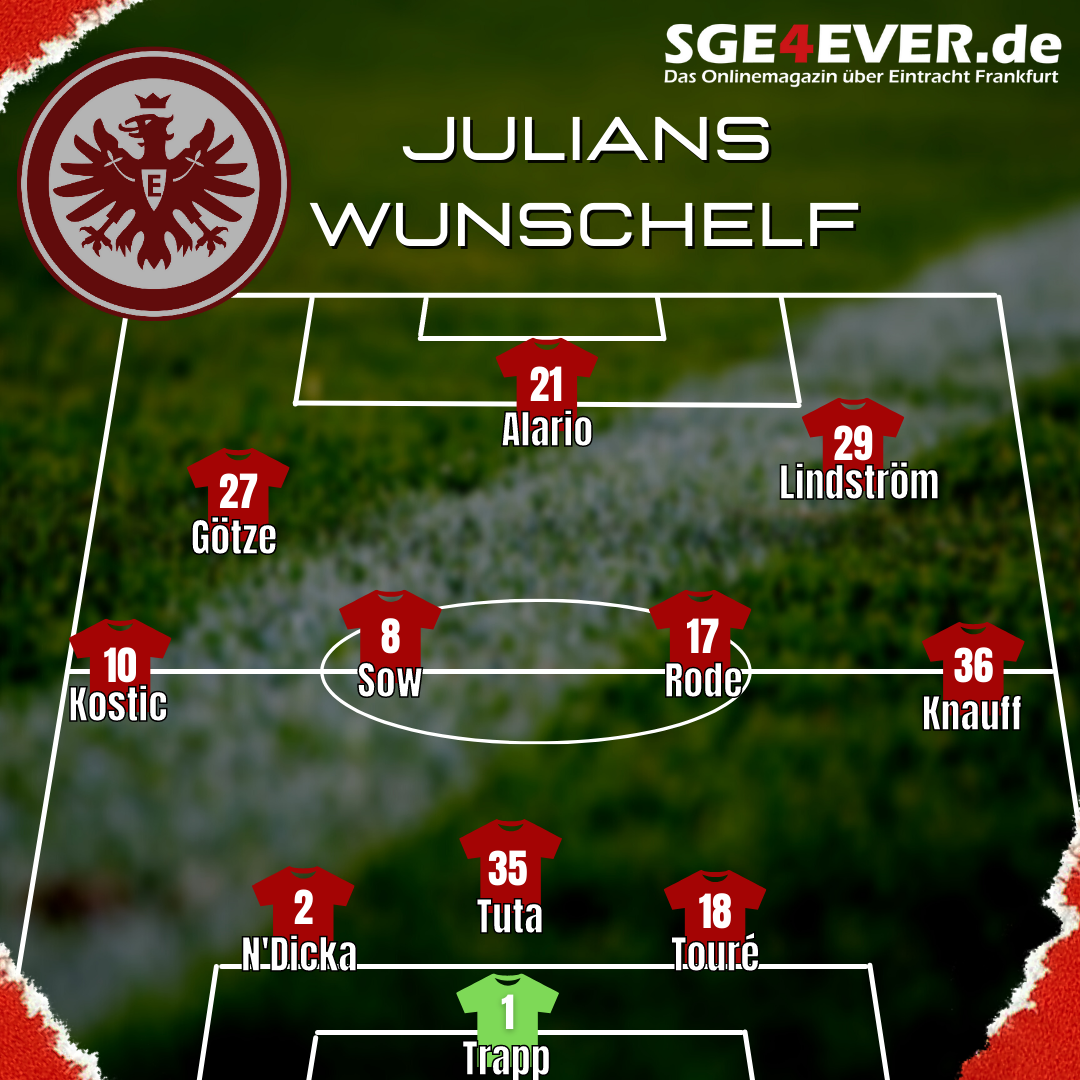 Diese Aufstellung gleicht der Aufstellung aus dem Pokalspiel. Vor allem wird auf den breiten und qualitativ guten Kader aufgebaut. Denn bewusst startet die Eintracht so mit Rafael Borré, der vorne viel arbeitet. Im Verlauf des Spiels können somit aber noch Kolo Muani und Lucas Alario eingewechselt werden. Muani zuerst, denn durch die Schnelligkeit wird er müde gespielte Gegner komplett um den Verstand bringen und wenn ab der 75. Minute immer noch ein Tor gebraucht wird, kann Alario rein, um den Rammbock auszupacken. Natürlich muss aber jeder Stürmer ausreichend Spielzeit bekommen. Es geht ja aber um meine Wunschelf für den Saisonstart. Ansonsten vertraue ich auf Glasners Entscheidung mit Kamada weiter zurückgezogen im Mittelfeld und Götze etwas weiter vorne. Derzeit sehe ich in der Abwehr Almamy Touré noch vorne neben den beiden gesetzten Evan N’Dicka und Tuta. Er bestätigt seine Europa-League-Form, weshalb ihm das Vertrauen zunächst geschenkt bekommen sollte.