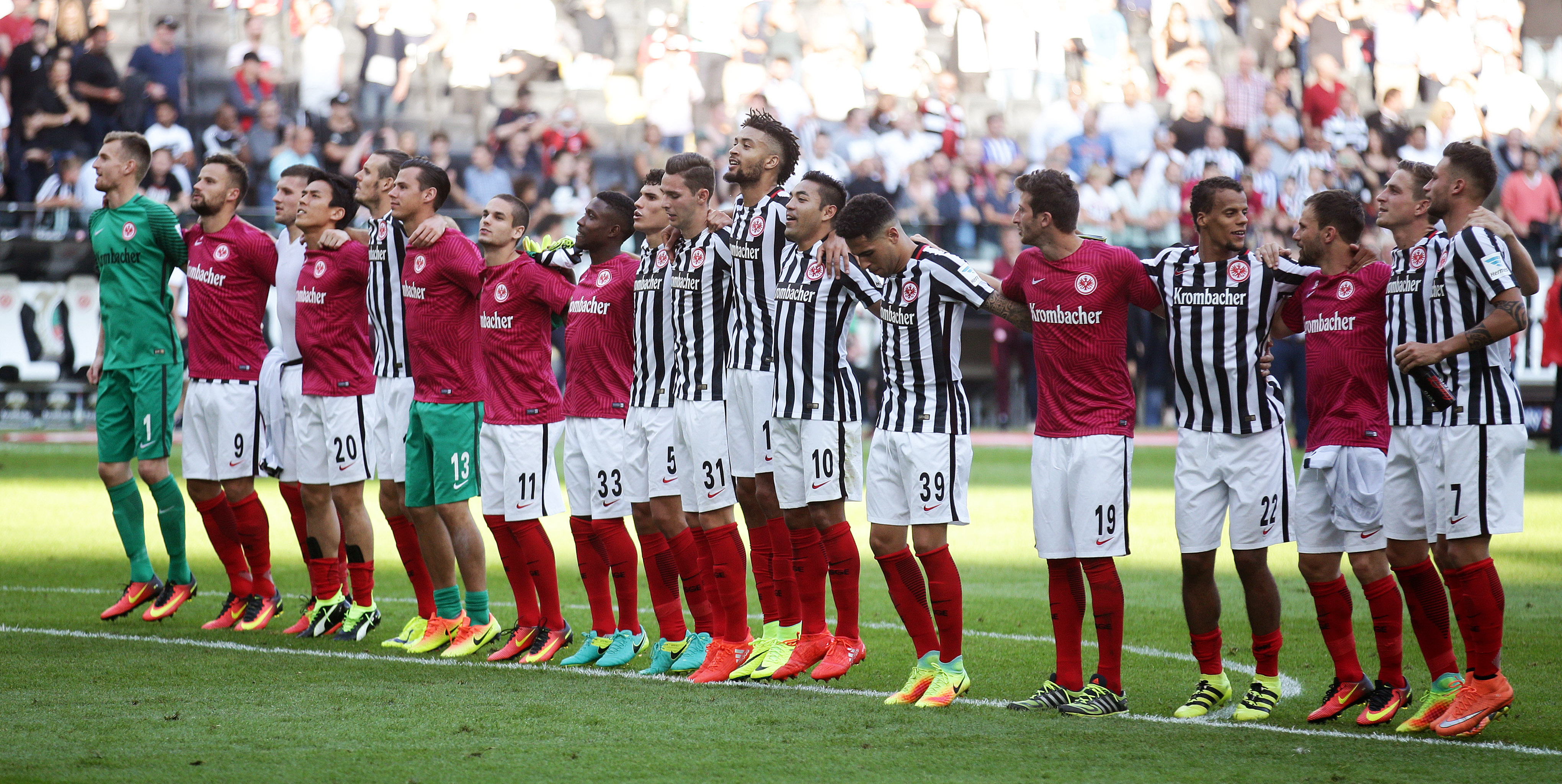 Sportdirektor Bruno Hübner, der vor einem Jahr noch mächtig in der Kritik stand und sich inzwischen freischwimmen konnte, spürt die gute Stimmung in der Stadt und hat in der Mitgliederzahl von 40.000 die Bestätigung dafür erhalten: „Wir haben ein stabiles Auftreten und eine symphatische Mannschaft. Das können wir alles noch weiter ausbauen.“ Es menschelt bei den Hessen, die schnell zu einer verschworenen Truppe zusammengewachsen sind. Lukas Hradecky, Torhüter und unumstrittener Leistungsträger seit eineinhalb Jahren bei der Eintracht, lobt den Zusammenhalt: „Es ist nie leise bei uns in der Kabine und jeder hat einen Freund und wir kommen auch untereinander alle gut klar. Das ist der Schlüssel für den Erfolg!“