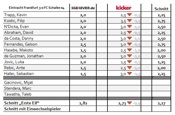 An der Leser-Bewertung gemessen, betrug die durchschnittliche Mannschaftsleistung der elf zensierten Spieler den Wert 1,82. Die Einzelnoten der über 900 abstimmenden SGE4EVER.de-User im Überblick: