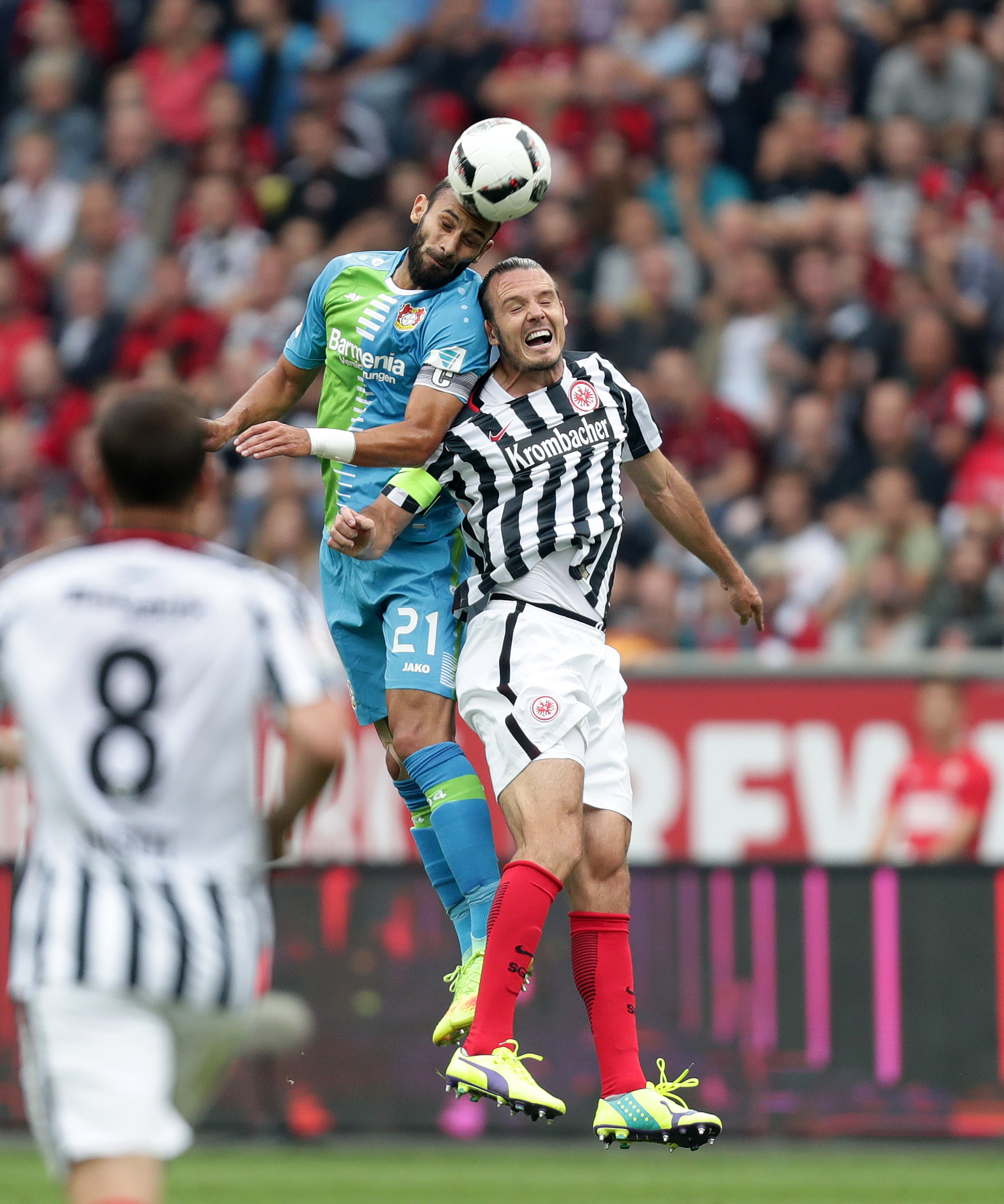 Wenn die ersten zwei Heimspiele ein Maßstab für die ganze Saison sein können, sollten Stadionbesucher künftig rechtzeitig vor dem Anpfiff ihren Platz einnehmen. Wie schon gegen Schalke legten die Kovac-Schützlinge von Beginn an los, als wollten sie die Werkself überrennen. Insbesonders über Bastian Oczipka und Seferovic wurden Angriffe vorgetragen, die Viererkette, vor allem die beiden Außenverteidiger, standen sehr hoch und übten rechtzeitig Druck auf ihre Gegenspieler aus. Leverkusen war sichtlich überrascht von der Frankfurter Dynamik und fand in der Zentrale keine Anspielstationen, da Huszti und Hasebe – unterstützt durch Fabián und die beiden offensiven Außen – die Räume dicht machten. Der Begriff „kompakt stehen“ ist eine inflationär gebrauchte Vokabel für einstudiert exerziertes Abwehrverhalten, aber gestern konnten wir erstmals erleben, wie das Trainerteam sich das vorstellt. Nicht nur die beiden Sechser, sondern auch alle Offensivkräfte erfüllten ihre defensiven Aufgaben vorbildlich, sodass Leverkusener Chancen einzig durch Fehler im Spielaufbau resultierten.