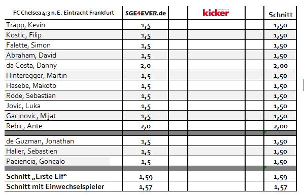 An der Leser-Bewertung gemessen, betrug die durchschnittliche Mannschaftsleistung gegen FC Chelsea der vierzehn zensierten Spieler den Wert 1,57. Die Einzelnoten der 500 abstimmenden SGE4EVER.de-User im Überblick: