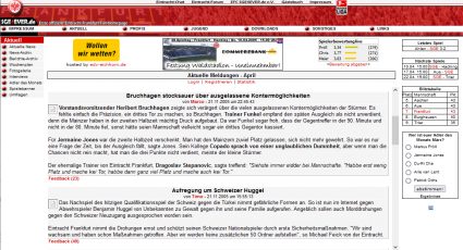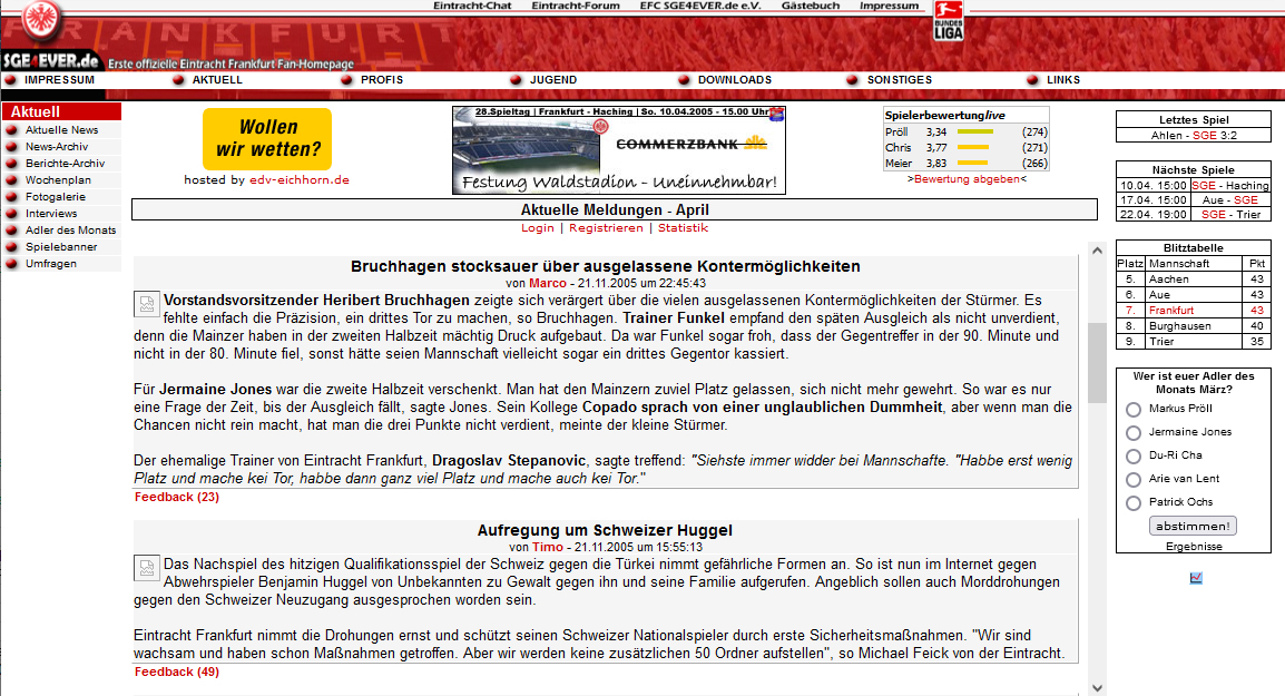 Also baute ich eine Eintracht Fan-Seite, auf der ich die Dateien zum Download zur Verfügung stellen wollte. Aber es sollte nicht irgendeine Seite sein, nein, die Fans sollten sich auf meiner Seite wohl fühlen. Sie sollten sich „wie zu Hause fühlen“, das war meine Idee. Also war die jugendlich naive Konsequenz logisch: Dann soll meine Seite einfach so aussehen, wie die damalige offizielle Eintracht-Seite. Kurz im Eintracht-Chat die User gefragt, was sie von der Idee halten würden: Sie waren begeistert! Urheberrechts-Ignoranz die Zweite.