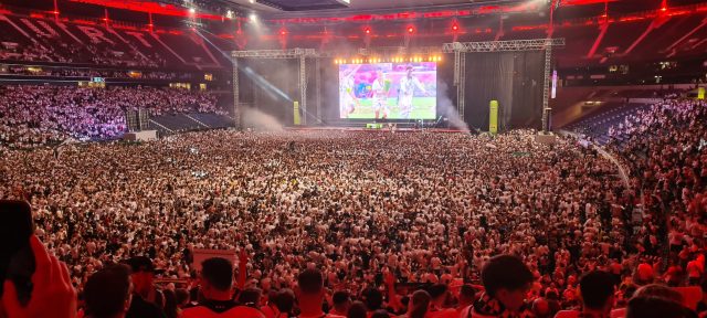Marcel: „Als es endlich geschafft war, kannte auch auf der Pressetribüne bei den mitgereisten Frankfurter Journalisten die Freude kein Halten mehr. Jeder fiel jedem um den Arm, ein Kollege aus dem Eintracht-Medienteam hatte just um 0.00 Uhr Geburtstag. Bei aller Euphorie hieß es noch den Spielbericht zu Ende schreiben, um die Leser von SGE4EVER.de bestmöglich zu informieren. Sehr besonders waren die Momente nach der Siegerehrung, als die Mannschaft sofort den Weg in die Kurve einschlug und den Fans den Pokal präsentierte. Ein Bild, dass das Band zwischen Team und Anhängern ganz besonders deutlich machte. Nach den ersten Feierlichkeiten ging es zur Pressekonferenz, wo ein heiserer Kevin Trapp und Oliver Glasner Rede und Antwort standen, bevor die Mannschaft zur obligatorischen Bierdusche hereincrashte. Um kurz vor 2 Uhr plauderte Peter Fischer noch vor dem Stadion mit einer handvoll Fans, Goncalo Paciencia posierte mit Anhängern für ein Selfie. Jetzt nochmal in eine Bar, ein Bierchen nach getaner „Arbeit“, so hatten wir es uns ausgemalt. Doch alle Bars waren dicht. Die Stadt glich einer Geisterstadt. Zurück in der Fanzone gab es zwar noch etwas zu trinken, aber alle waren angesichts der Hitze, Dramatik und mangelnder Wasservorräte im Stadion komplett am Ende. So endet auch für uns die Nacht um 4 Uhr. Zu dritt in einem gemieteten Kleinbus, den wir in einer Tiefgarage geparkt und als günstigste Übernachtungsmöglichkeit auserkoren hatten. Das unspektakuläre Ende einer spektakulären Europa-League-Reise.“