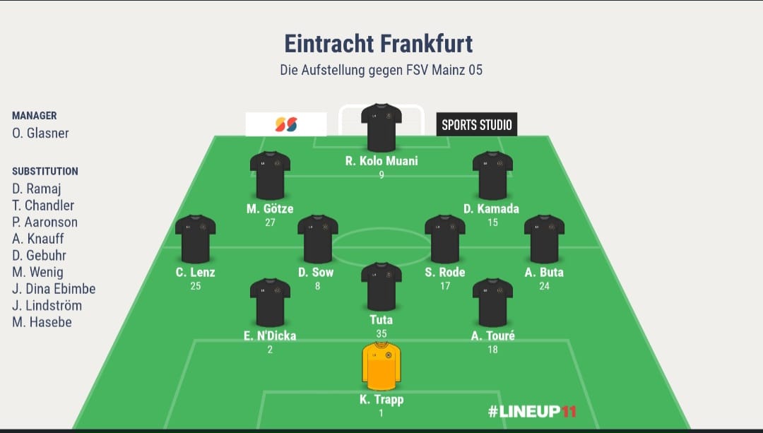 Die Aufstellung der SGE: Trapp (GK) – Lenz, N´Dicka, Tuta, Touré, Buta – Rode (C), Sow – Götze, Kamada – Kolo Muani