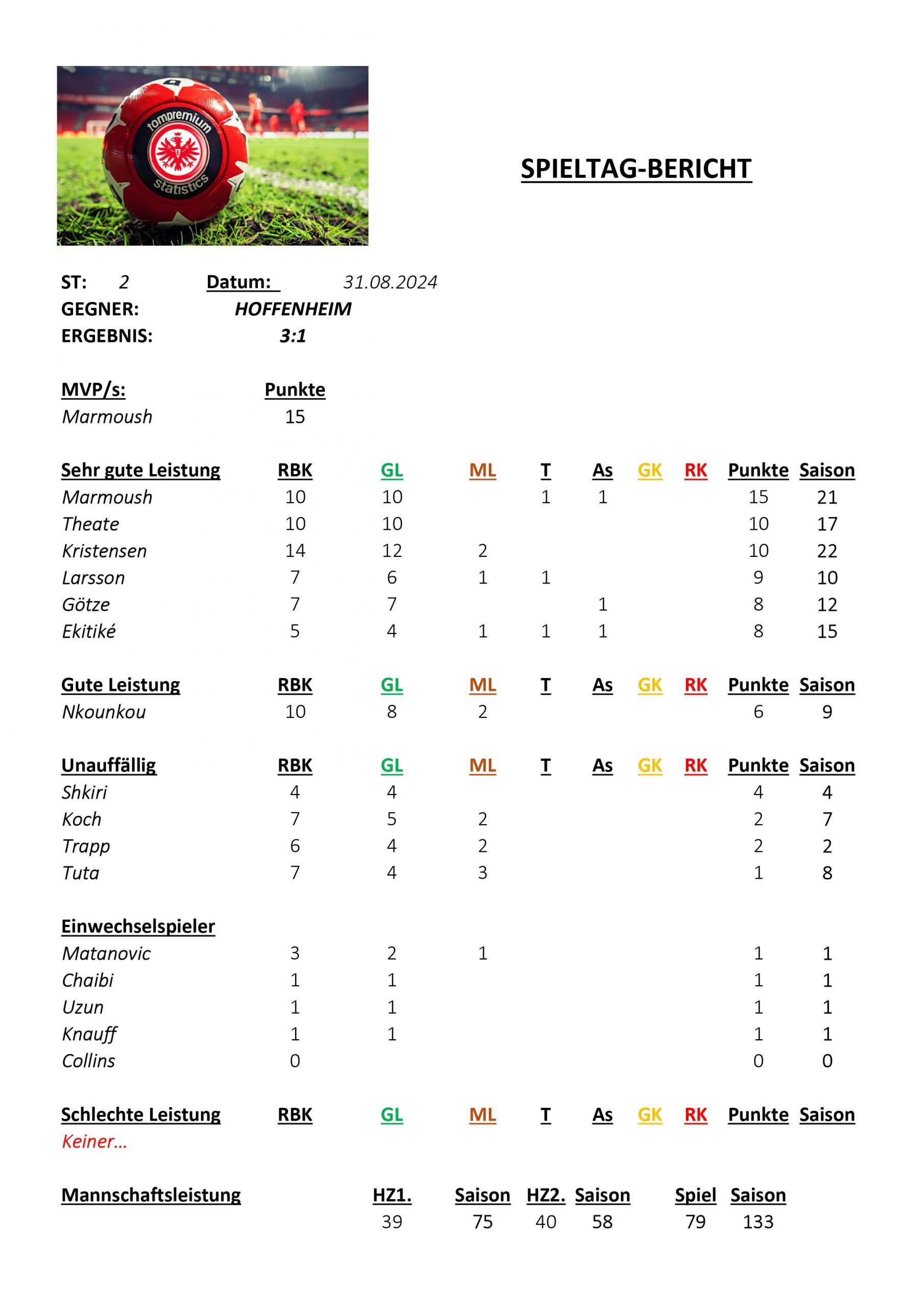 Zu 1.: Hier erlaube ich mir zu beurteilen, inwieweit der Trainer die laufenden Spielerleistungen in den bisher absolvierten Saison-Spielen im Saisonverlauf Rechnung trägt. Kleines Beispiel: In der abgelaufenen Saison hatte ich durchaus Probleme mit der Aufstellung bzw. Einwechslungen der Spieler Buta, Max und Chandler.