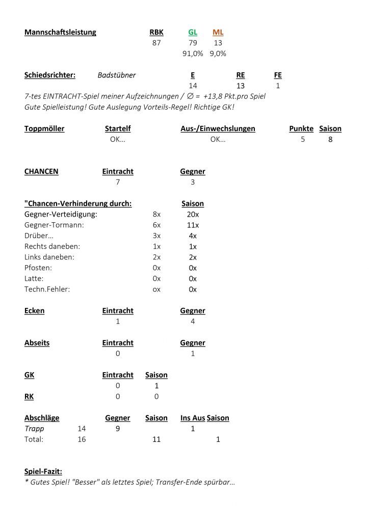 Für den Trainer, die Mannschaft, die Spieler selbst, ist jedoch meine Aufzeichnung ein nachvollziehbares, detailliertes Abbild des tatsächlich erlebten Spielverlaufs. Dann jedoch mit der Möglichkeit, in der nachträglichen Einzelanalyse gelungene Vorgaben als „umgesetzt“ zu belegen bzw. individuelle Fehler – spielerbezogen – aufzeigen und verinnerlichen zu können…