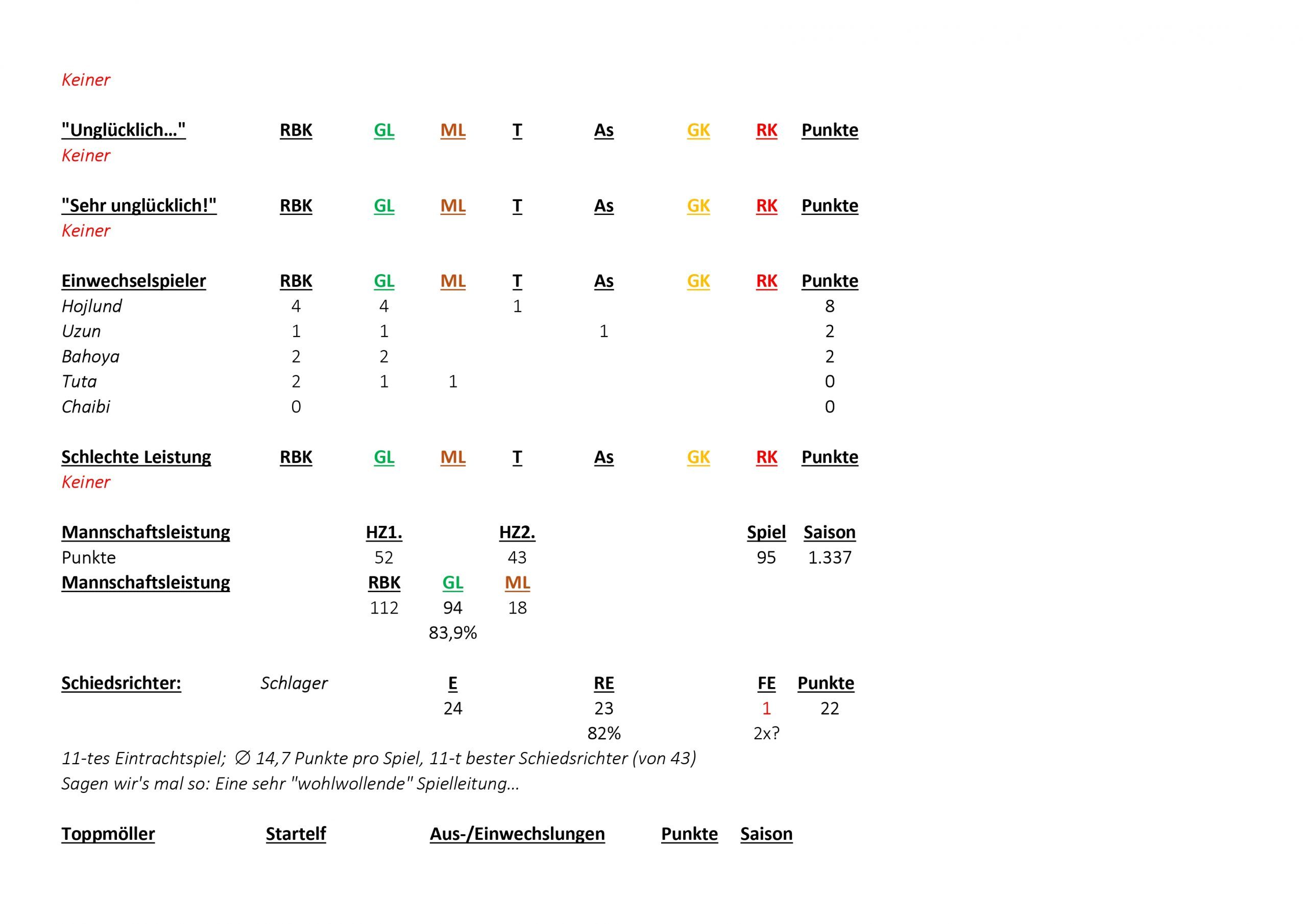 Dabei werden sowohl die „guten“, als auch die „schlechten“ relevanten Ball-Kontakte (RBK) anhand eines einfachen Punktesystems bewertet: