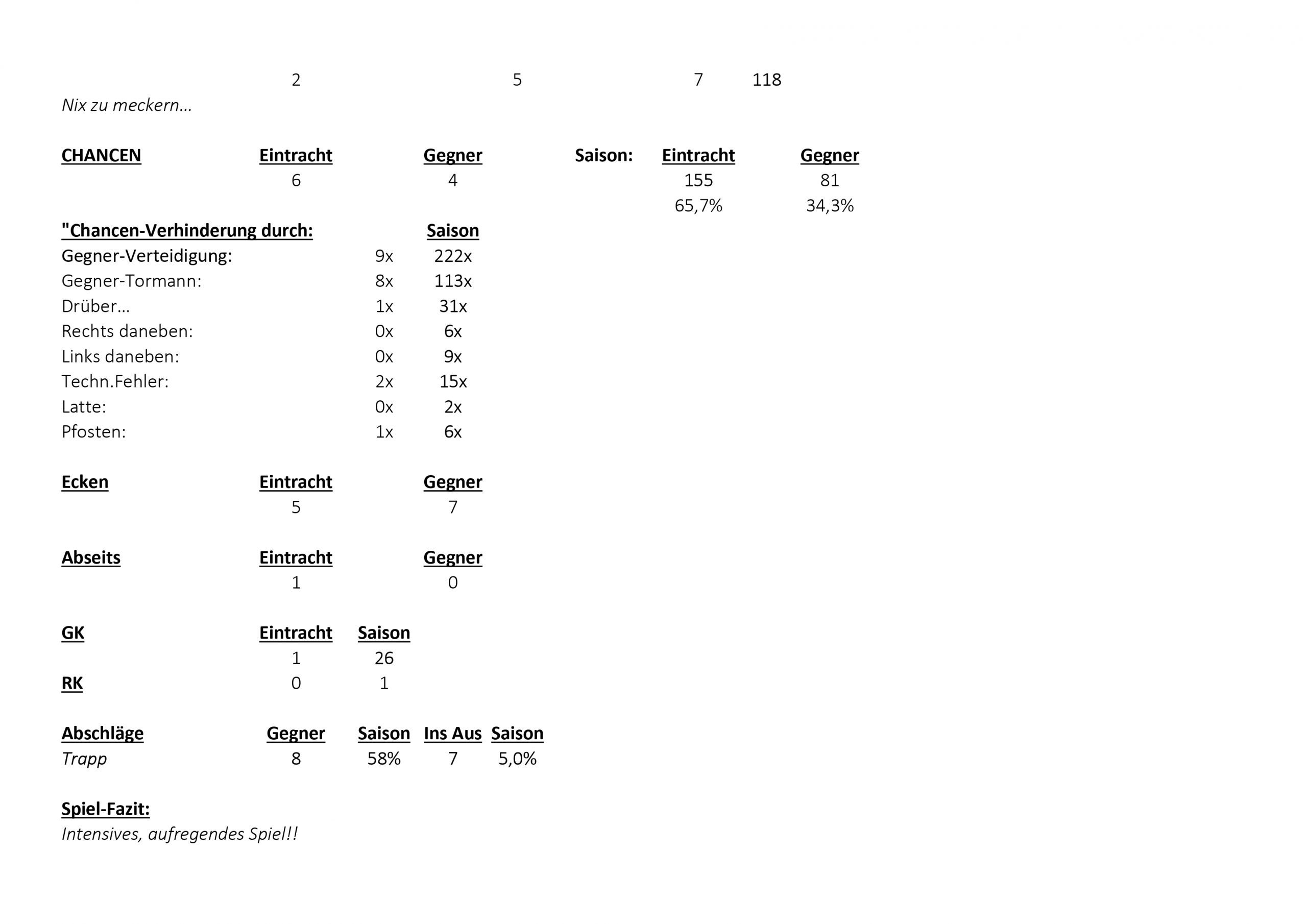 Bei den Eintracht-Statistics wird sich um die Beurteilung der im Verlaufe eines absolvierten vollständigen Spiels (90 Min. + Nachspielzeit) tatsächlich erbrachten guten bzw. schlechten Spielerleistungen der einzelnen Spieler von Eintracht Frankfurt, in Bezug auf der für den Spielverlauf relevanten Ballaktionen bemüht.