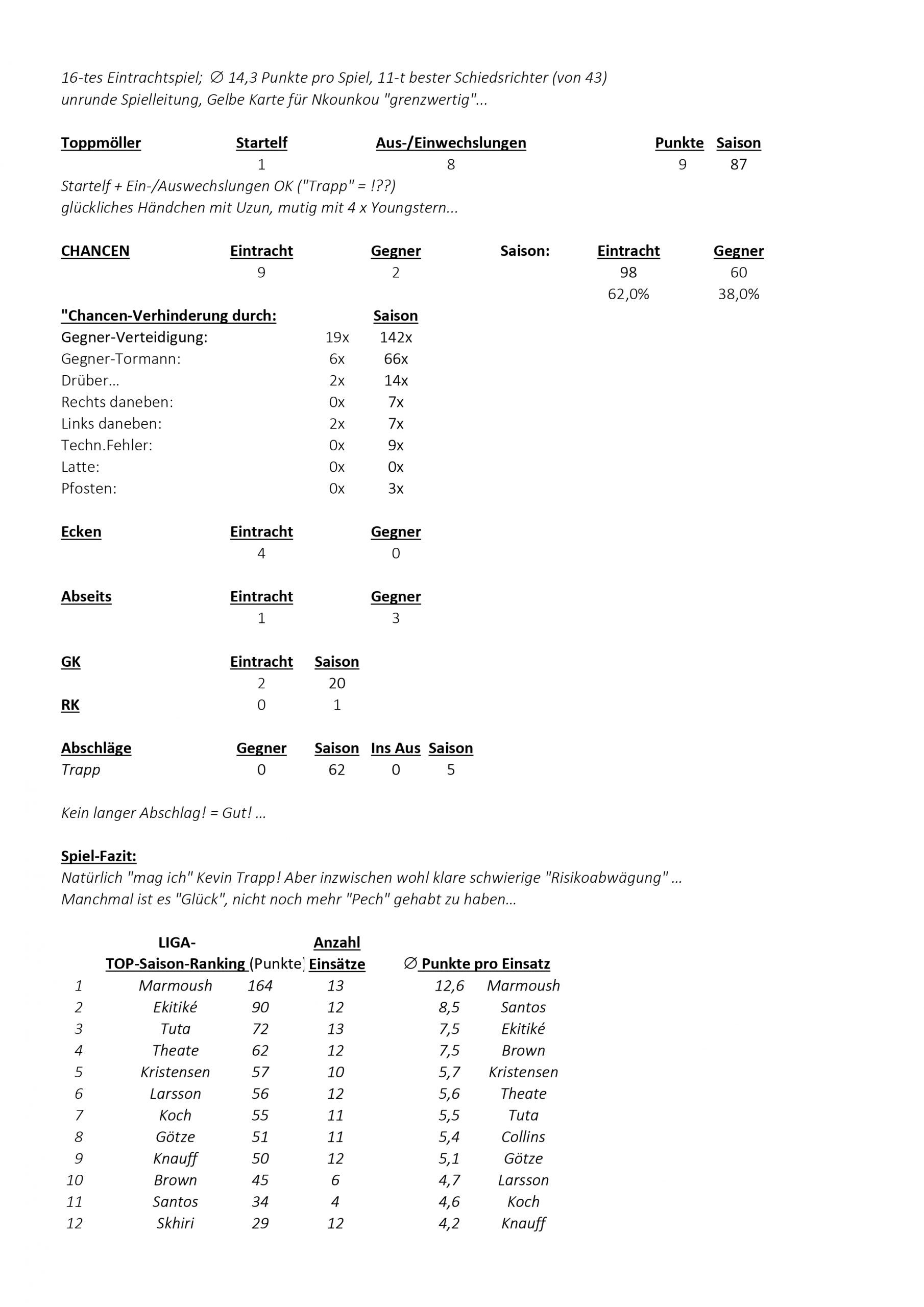 Bei den Eintracht-Statistics wird sich um die Beurteilung der im Verlaufe eines absolvierten vollständigen Spiels (90 Min. + Nachspielzeit) tatsächlich erbrachten guten bzw. schlechten Spielerleistungen der einzelnen Spieler von Eintracht Frankfurt, in Bezug auf der für den Spielverlauf relevanten Ballaktionen bemüht.
