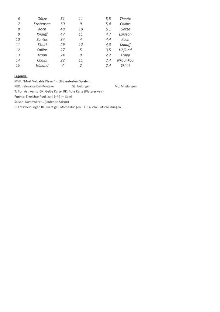 Bei den Eintracht-Statistics wird sich um die Beurteilung der im Verlaufe eines absolvierten vollständigen Spiels (90 Min. + Nachspielzeit) tatsächlich erbrachten guten bzw. schlechten Spielerleistungen der einzelnen Spieler von Eintracht Frankfurt, in Bezug auf der für den Spielverlauf relevanten Ballaktionen bemüht.