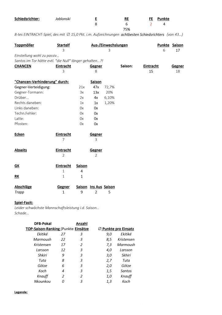 Bei den Eintracht-Statistics wird sich um die Beurteilung der im Verlaufe eines absolvierten vollständigen Spiels (90 Min. + Nachspielzeit) tatsächlich erbrachten guten bzw. schlechten Spielerleistungen der einzelnen Spieler von Eintracht Frankfurt, in Bezug auf der für den Spielverlauf relevanten Ballaktionen bemüht.