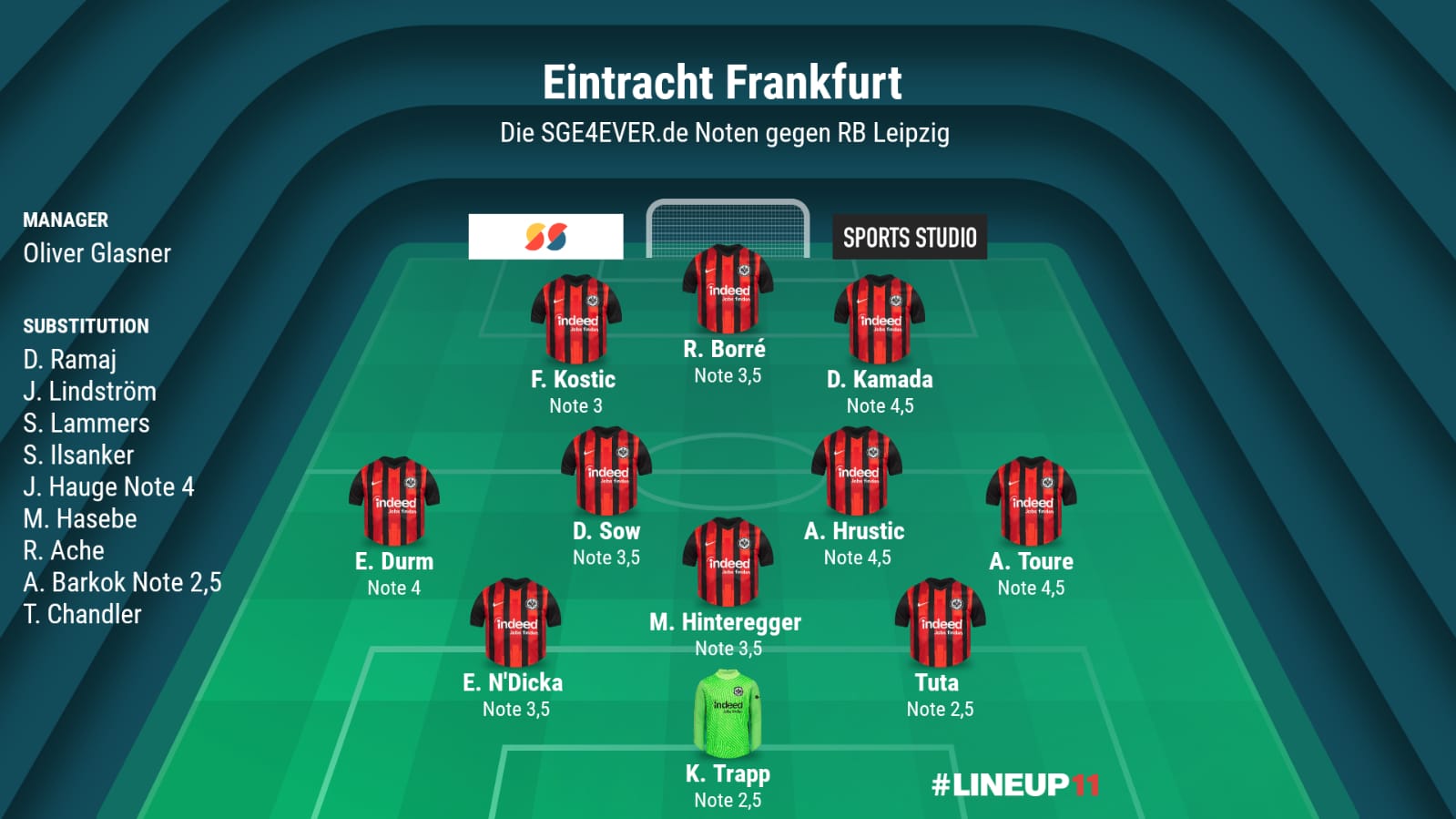 An der Leser-Bewertung gemessen, betrug die durchschnittliche Mannschaftsleistung gegen RB Leipzig der dreizehn zensierten Spieler den Wert 3,54. Die Leistungen innerhalb einer Kategorie sind von oben nach unten zu bewerten. Der erste Spieler einer Kategorie hatte das beste Gesamtergebnis, der letzte Spieler das Schlechteste innerhalb der Kategorie. Die Einzelnoten der 380 abstimmenden SGE4EVER.de-User im Überblick: