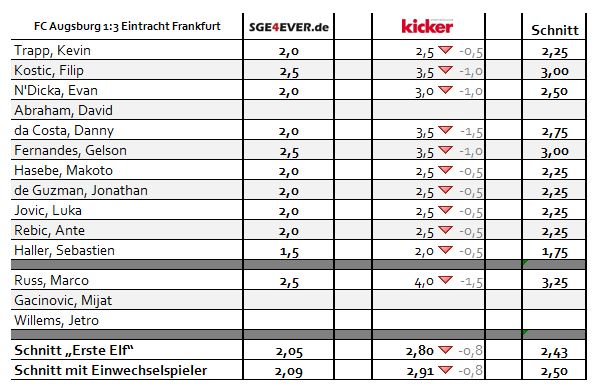 An der Leser-Bewertung gemessen, betrug die durchschnittliche Mannschaftsleistung der elf zensierten Spieler den Wert 2,09. Die Einzelnoten der über 770 abstimmenden SGE4EVER.de-User im Überblick: