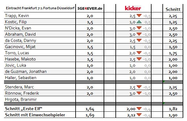 An der Leser-Bewertung gemessen, betrug die durchschnittliche Mannschaftsleistung der dreizehn zensierten Spieler den Wert 1,69. Die Einzelnoten der 1110 abstimmenden SGE4EVER.de-User im Überblick: