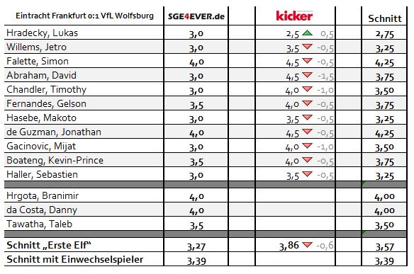 Lukas Hradecky konnte die Niederlage seiner Mannschaft nicht verhindern. Der Schuss von Didavi in der 22. Minute war für ihn nicht haltbar, drei Minuten später verhinderte er aber den Doppelschlag der Wölfe, als er den Schuss von Dimata mit dem Fuß noch so eben ablenkte. Ansonsten war der Finne über weite Strecken beschäftigungslos. Seine Leistung reicht aber trotzdem aus, um im Vergleich zu seinen Mitspielern am besten abzuschneiden. Makoto Hasebe brillierte mit einer Passquote von über 90 Prozent, seine Zweikampfwerte (38 Prozent) waren allerdings noch ausbaufähig. Insgesamt kann man dem Japaner keinen Vorwurf machen. Die Leser von SGE4EVER.de honorierten seinen Auftritt mit einem „Befriedigend“. Mijat Gacinovic gab gegen Wolfsburg drei Torschüsse ab, die aber alle nicht im gegnerischen Tor unterkamen. Seine beiden Kopfball-Chancen entschärfte Casteels bravourös. Ähnliches gilt für Haller, der einen ordentlichen Eindruck hinterlassen konnte, aber ebenfalls nicht das Tor traf. Timothy Chandler und Jetro Willems beackerten die linke und rechte Seite unermüdlich, doch auch deren Vorstöße konnten kein Tor erzwingen. Defensiv stand Willems allerdings sicherer, der 70 Prozent seiner Zweikämpfe gewann (Chandler 40 Prozent). David Abraham wirkte wie immer sehr abgeklärt und ruhig im Spielaufbau. Das Gegentor konnte er nicht verhindern. Auch für ihn gibt es somit die Note 3,0.