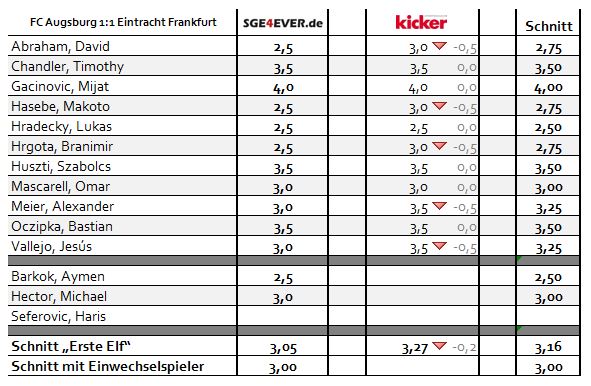 Zuletzt stand Lukas Hradecky beim Spiel gegen Borussia Mönchengladbach an der Spitze. Gegen den FC Augsburg reichte es wieder für ganz oben. Hielt seine Mannschaft mit insgesamt fünf Paraden immer im Spiel. Beim Gegentor durch Ji konnte er nichts verhindern. Aymen Barkok brachte als Einwechselung noch einmal Belebung in das Offensivspiel der Frankfurter, wenngleich ihm natürlich noch die Erfahrung fehlt, um gewisse Situationen einzuschätzen. Branimir Hrgota war der Torschütze des Tages. Nach dem Führungstreffer hatte es der Schwede aber zunehmend schwerer mit der gegnerischen Verteidigung. Insgesamt konnte er sich aber für seine Leistung endlich auch mit einem Treffer belohnen. David Abraham machte ein sehr ordentliches Spiel. Gewann mit 78 % die meisten Zweikämpfe der Defensivabteilung. Business as usual beim Argentinier! Makoto Hasebe konnte ebenfalls seine Form der letzten Wochen abrufen. Immer anspielbar und mit vielen Ideen bestückt. An ihm lag es nicht, dass es „nur“ ein Unentschieden am Ende wurde.