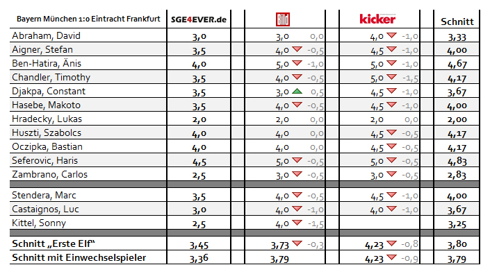 Eine ordentliche Partie des Ersatz-Kapitäns. Durch das Fehlen von Alex Meier und Marco Russ durfte Carlos Zambrano erstmals die Binde tragen. Und diese Ehre beflügelte ihn scheinbar: Zwar konnte auch er Franck Ribery nicht immer stoppen, dennoch brachte er die Bayern-Offensive ein ums andere Mal zur Verzweiflung. War nach Stefan Aigner der zweikampfstärkste Spieler (11 gewonnen) auf dem Platz der SGE und wirkte bissig, ohne unfair zu agieren. Sonny Kittel belebte nach seiner Einwechselung die Offensive der Frankfurter maßgeblich. Hatte in der 82. Minute sogar den Ausgleich auf dem Fuß nach einer tollen Ballannahme. Knapp ein Jahr nach seinem Kreuzbandriss scheint er wieder der Alte zu sein und damit sicherlich eine Alternative für die Startelf gegen Hoffenheim.