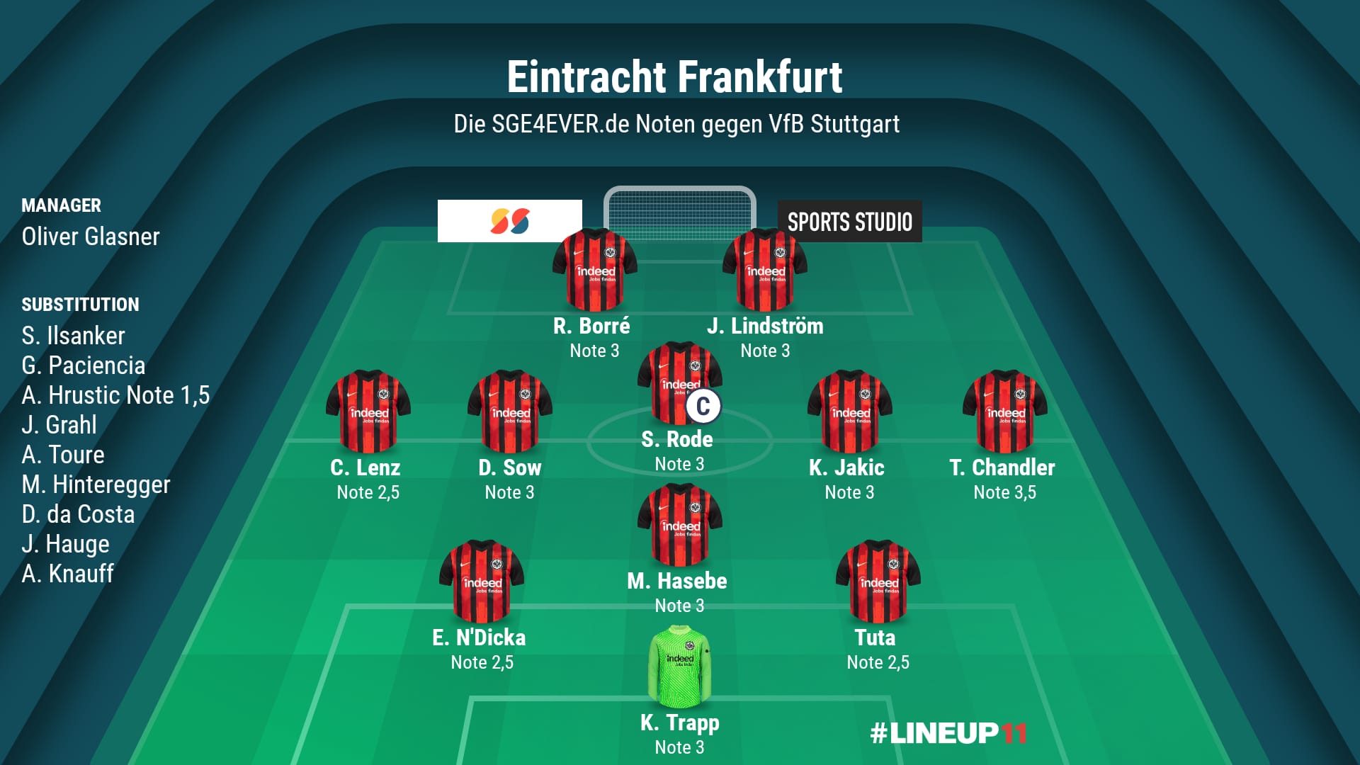 An der Leser-Bewertung gemessen, betrug die durchschnittliche Mannschaftsleistung gegen VfB Stuttgart der zwölf zensierten Spieler den Wert 2,79. Die Leistungen innerhalb einer Kategorie sind von oben nach unten zu bewerten. Der erste Spieler einer Kategorie hatte das beste Gesamtergebnis, der letzte Spieler das Schlechteste innerhalb der Kategorie. Die Einzelnoten der über 460 abstimmenden SGE4EVER.de-User im Überblick: