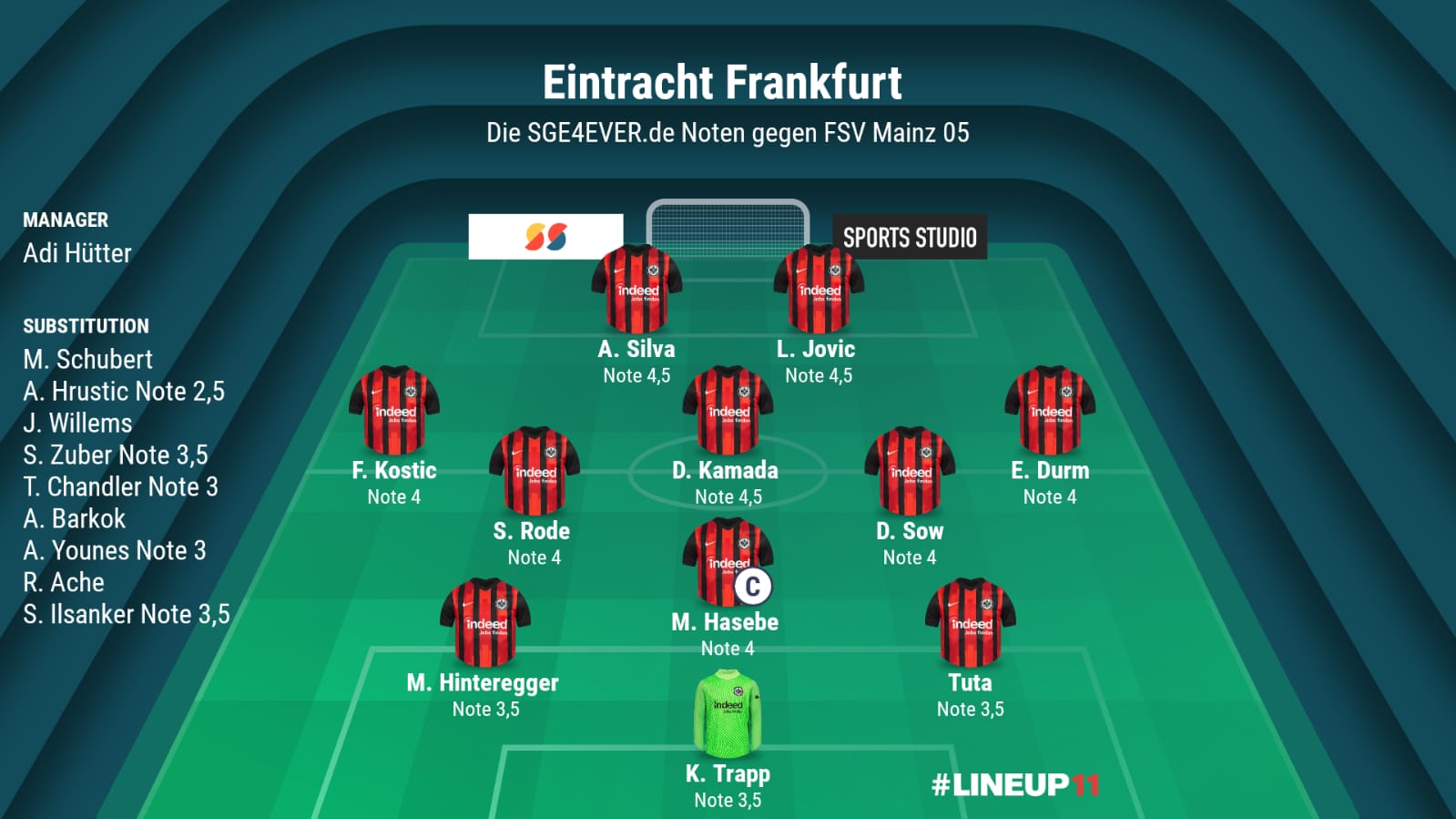 Nach der 1:3-Niederlage in Leverkusen tauschte Adi Hütter sein Team auf drei Stellen aus. Tuta, Sebastian Rode und Luka Jovic ersetzten Stefan Ilsanker, Aymen Barkok (beide Bank) und Evan N’Dicka (Gelbsperre). Ragnar Ache feierte eine Blitzgenesung und nahm erstmals wieder auf der Bank Platz.