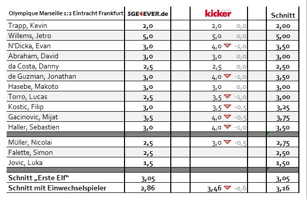 An der Leser-Bewertung gemessen, betrug die durchschnittliche Mannschaftsleistung der vierzehn zensierten Spieler den Wert 2,86. Die Einzelnoten der über 520 abstimmenden SGE4EVER.de-User im Überblick: