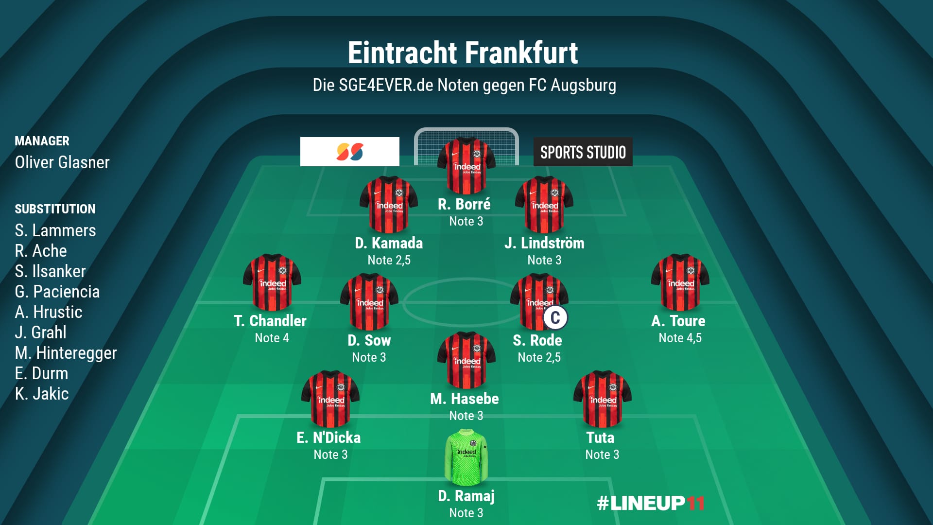 An der Leser-Bewertung gemessen, betrug die durchschnittliche Mannschaftsleistung gegen FC Augsburg. der elf zensierten Spieler den Wert 3,14. Die Leistungen innerhalb einer Kategorie sind von oben nach unten zu bewerten. Der erste Spieler einer Kategorie hatte das beste Gesamtergebnis, der letzte Spieler das Schlechteste innerhalb der Kategorie. Die Einzelnoten der über 350 abstimmenden SGE4EVER.de-User im Überblick: