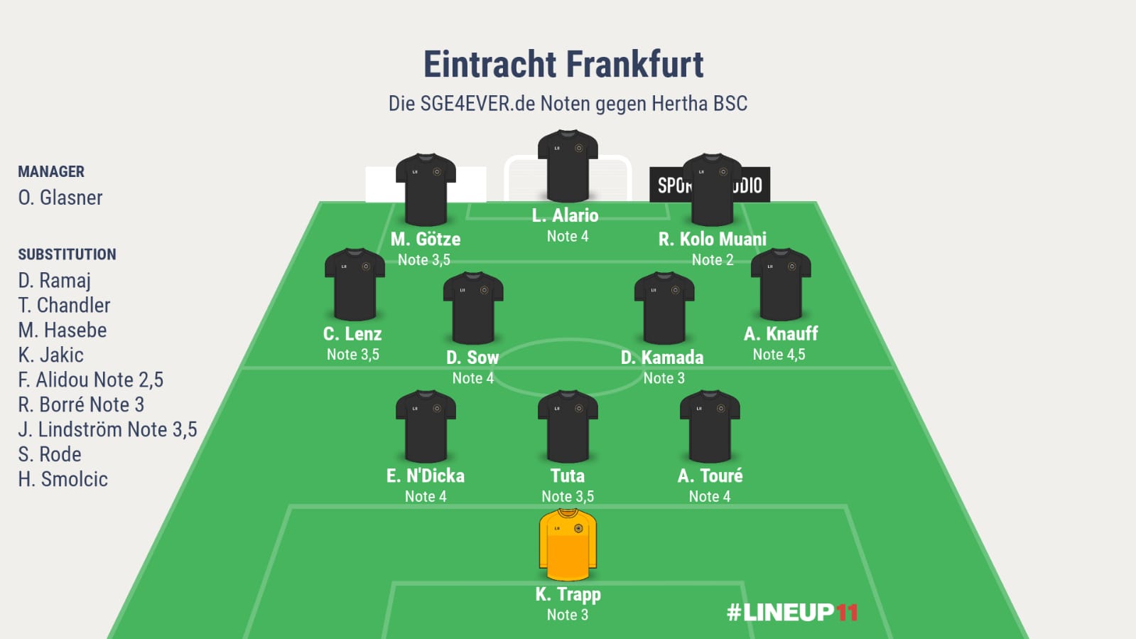 Kolo Muani war - wieder einmal - der beste Eintrachtspieler und ist gegenwärtig unser Königstransfer. Götze ist bisher noch nicht so stark in Erscheinung getreten. Angesichts der Leistungen von Kamada würde ich wie @2 Kamada wieder offensiver einstellen. Ich mag den zwei Spitzensturm vor Kamada, weil alle drei ihre Positionen variieren können. Aber auch eine Variante mit Götze kann ich mir vorstellen, wobei ich denke, dass er erst Mal vo der Bank kommen sollte. Vielleicht sollte Lindstrom auf links rücken (mit Alidou als Backup). Jakic im defensiven Mittelfeld gefällt mir auch, da wir dort stabiler sind und gefühlt mehr Zweikämpfe gewinnen. Momentan geht uns ein wenig die Galligkeit ab. Mit Schönspielen alleine werden wir keine Punkte sammeln.