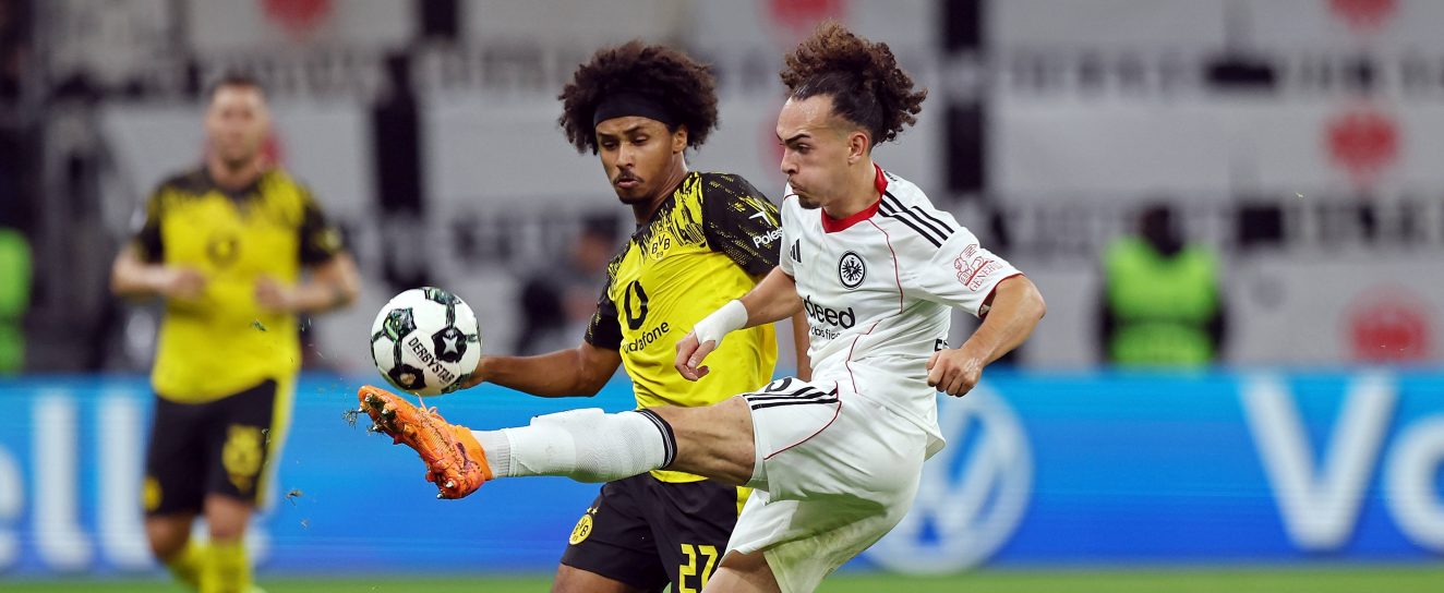 Bereits in den ersten Minuten war es ein intensives Spiel mit zahlreichen Zweikämpfen. Die Dortmunder liefen die Frankfurter Hintermannschaft hoch an und kamen bereits nach fünf Minuten zu einer guten Gelegenheit. Karim Adeyemi kam rechts im Strafraum an den Ball, verschaffte sich mit einer schnellen Körpertäuschung Platz und schlenzte den Ball knapp am langen Eck vorbei. Direkt im Gegenzug war dann mal die SGE dran und schlug zu: Ein langer Ball aus der Kette landete über Umwege bei Mario Götze. Der 33-Jährige reagierte blitzschnell und schickte mit einem präzisen Ball in die Schnittstelle Ansgar Knauff auf die Reise. Der blieb ganz cool und schob zur 1:0-Führung gegen seinen Ex- und Ausbildungsverein ein. Trotz des Gegentreffers blieb der BVB die spielbestimmende Mannschaft. Die Eintracht stand aber sehr sicher und gut organisiert, sodass die Angriffe konzentriert abgewehrt wurden. In der Offensive versuchte man immer wieder mit langen Bällen und über die schnellen Flügel Nadelstiche zu setzen. Brenzlig wurde es bei BVB-Angriffen meist nur über die rechte Seite mit Adeyemi und Julian Ryerson. Richtig zwingend wurde es aber zunächst nicht. Auch auf der anderen Seite entwickelte sich immer mehr ein persönliches Duell zwischen Knauff und Aaron Anselmino, die immer wieder aufeinandertrafen.