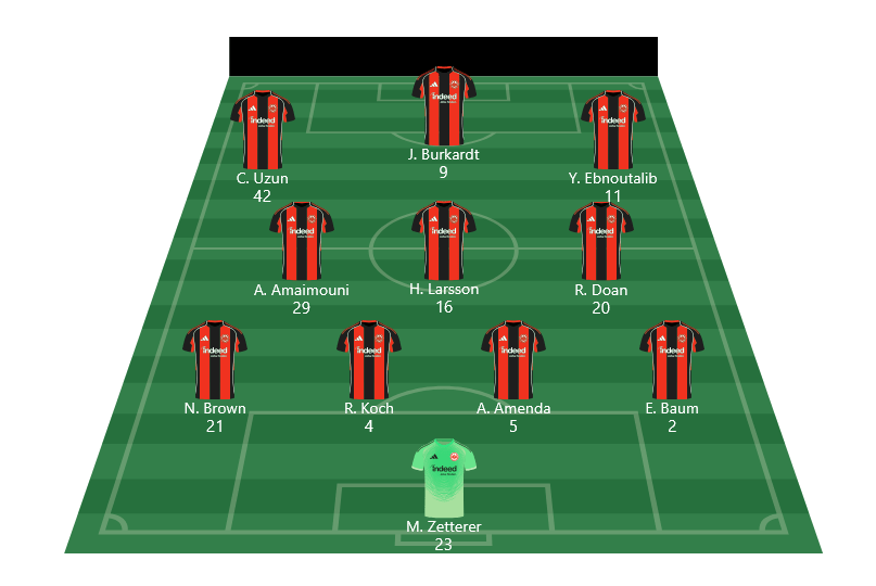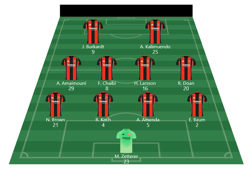 Erklärung: Mit seinen Leistungen unter Riera hat sich Amenda vor Arthur Theate in die Startelf gespielt. Außerdem kehrt Koch nach seiner Gelb-Rot-Sperre zurück. Auf der Position des Rechtsverteidigers erhält Baum für den zuletzt schwächelnden und verletzten Nnamdi Collins zum ersten Mal die Chance von Beginn an. Links ist Nathaniel Brown gesetzt. Im zentralen Mittelfeld spielt Farés Chaibi, der dank seiner Technik und Kreativität eine wichtige Rolle in Rieras Ballbesitzfußball einnehmen kann und auf der Acht in dieser Saison bereits starke Leistungen gezeigt hat. Unterstützt wird er mangels Alternativen von Larsson, auch weil sich andere Kandidaten wie Oscar Højlund und Ellyes Skhiri in den vergangenen Wochen nicht für einen Startelfplatz empfohlen haben. Im rechten Mittelfeld wird Doan wieder auf der Position eingesetzt, auf der er seine Attribute am besten ins SGE-Spiel einbringen kann. Gegenüber startet Amaimouni-Echghouyab, der mit seiner Geschwindigkeit und Dribbelstärke wichtig für das Kreieren von Chancen werden kann. Vorne spielen Burkardt und Kalimuendo erstmals als Doppelspitze, um im Vergleich zu den letzten Spielen den Druck auf die gegnerische Verteidigung zu erhöhen und zwei der torgefährlichsten Spieler auf ihren besten Positionen spielen zu lassen. Im Ballbesitz kann sich außerdem je nach Situation einer der beiden auf die Zehn fallen lassen oder auf einen der Flügel rücken. Zudem kann entweder Chaibi oder Larsson bei Angriffen ins offensive Mittelfeld vorrücken, während der jeweils andere defensiv absichert.