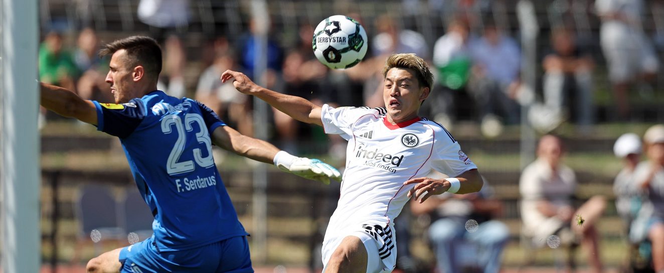 Wie unangenehm die Heimmannschaft für die Eintracht agiert, zeigt die 29. Minute. Ein ungestümes Einsteigen zog die bereits zweite gelbe Karte für den Oberligisten nach sich. Die Männer von Dino Toppmöller taten weiterhin sehr schwer, trotz viel Ballbesitz wussten sie nicht viel mit der Kugel anzufangen. Stattdessen traute sich der FV Engers in persona Simons in der 30. Minute vor das Tor von Grahl. Sein Versuch von links konnte der Trapp-Vertreter problemlos aus der Luft pflücken. 60 Sekunden später ist es Neuzugang Ritsu Doan, der die beste Gelegenheit auf dem Fuß hatte. Eine Flanke von Nkounkou landete beim Japaner, dessen Volleyabnahme mit dem Unterschenkel knapp vorbei schrammte. Auf der anderen Seite wurde es wieder gefährlich für den Champions League-Teilnehmer. Einem Einwurf von rechts vorausgegangen landete die Murmel nach einer Kopfballverlängerung fast beim Gegenspieler, die vom Bundesligisten gerade so geklärt werden konnte (33. Minute). Der auffälligste Akteur auf Seiten der Eintracht war Nkounkou, der auf der linken Seite für ordentlich Dampf sorgte und es in der 42. Minute aus der zweiten Reihe versuchte. Sein wuchtiger Schuss flog deutlich am rechten Pfosten vorbei. Eine aus hessischer Sicht schleppende Halbzeit fand doch ein positives Ende im doppelten Sinne. Zunächst war es Jean-Mattéo Bahoya, der eine Flanke von rechts im Rebound zur erlösenden Führung verwertete. Während die Fans noch jubelten, war es Ritsu Doan, der in seinem Debüt seinen Premierentreffer zelebrieren durfte. Uzun bewies ein gutes Auge und bediente den Flügeltechniker im richtigen Moment. Mit seiner Eleganz und Coolness erhöhte Doan auf ein komfortables 2:0. Damit war auch gleichzeitig Schluss. Mit einem standardmäßigen Zwei-Tore-Führung ging es in die Kabine.