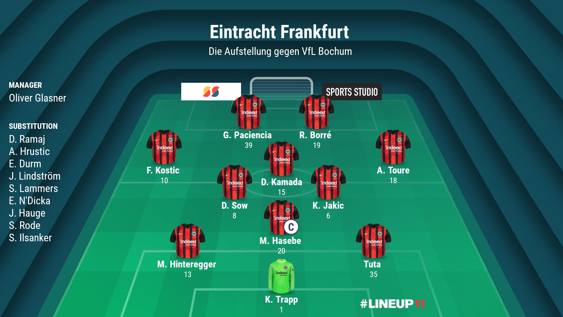 Mit einer unveränderten Aufstellung will SGE-Coach Oliver Glasner beim VfL Bochum punkten. Wie schon beim erfolgreichen 3:1 gegen Olympiakos Piräus vertraut der Österreicher auf eine Dreierkette mit Hasebe, Hinteregger und Tuta. Auf den Außen starten Kostic und Touré, in der defensiven Zentrale Jakic und Sow. Das Spiel soll Kamada ankurbeln und die beiden Spitzen Paciencia und Borré bedienen.