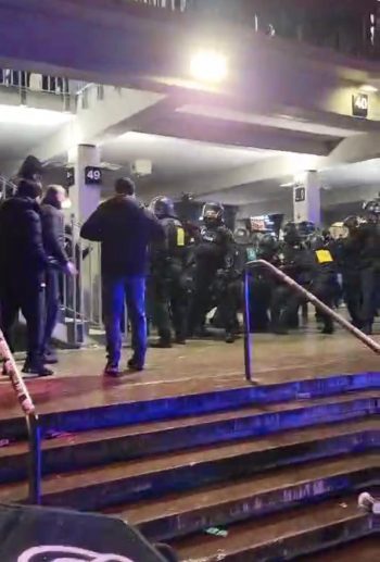 Ziemlich zu Beginn der Eskalation kommt ein RTW mit Blaulicht und Martinshorn vorgefahren, dem auch Platz gemacht wurde. Er hält ca auf Höhe des 40er Blocks an. Die Türen öffnen sich und aus dem hinteren Teil kommen Cops in voller Kampfmontur gesprungen, die direkt mitmischen… wtf