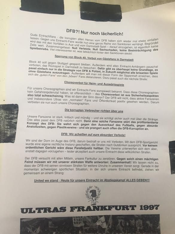 Ultras nehmen Stellung: Nach der Strafe des DFB-Sportgerichts haben sich nun auch die Ultras Frankfurt zu dem Strafmaß geäußert. Am Rande des Wolfsburg-Spiels ließen sie auf Plakaten verlauten, dass sie die Betrafung nicht nachvollziehen können, da es „Null Verletzte, Null Sachschaden & keine Beeinträchtigung des Spielbetriebs“ gegeben habe. Des Weiteren sehen sie in der Strafe die Strategie des DFB, „in Zukunft möglichst alle brisanten Spiele ohne Gästefans auszutragen“.
