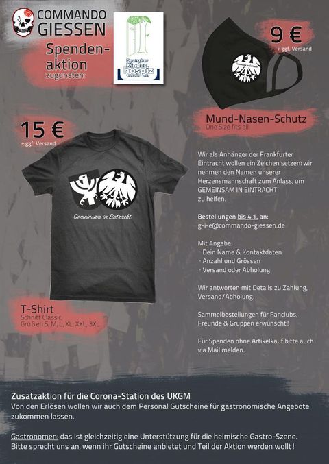Fan-Aktion: Die Eintracht-Fans stehen wie immer in Krisenzeiten besonders zusammen. Eine tolle Aktion gibt es derzeit vom Commando Gießen, bei denen ihr Eintracht-T-Shirts und Mundschutze bestellen könnt. Die Erlöse gehen dabei als Spende an den Deutscher Kinderhospizverein e.V., welcher Kinder, Jugendliche und junge Erwachsene, die an einer lebensverkürzenden Erkrankung leiden, begleitet. Des Weiteren ist geplant Teile der Erlöse dem Personal der Corona-Station des Universitätsklinikums Gießen-Marburg in Form von Gastro-Gutscheinen zukommen zu lassen. Damit möchte Commando Gießen auch der heimischen Gastronomie in Lockdown-Zeiten etwas unter die Arme greifen. Wer an der Aktion teilhaben möchte, auch als Gastronom, kann sich noch bis zum 4.1.2021 an g-i-e@commando-gießen wenden. Alle Infos zur Aktion findet ihr beim Klick auf das untenstehende Bild.