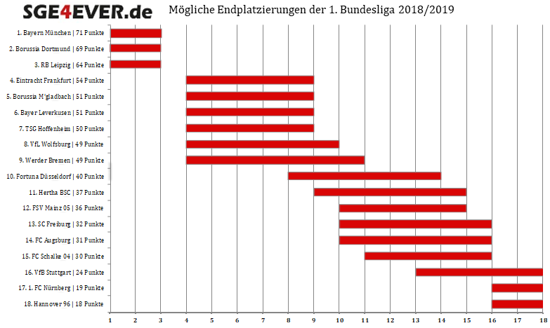 Potenzielle Endplatzierungen 2018/2019: In knapp drei Wochen wissen wir wohin der Weg von Eintracht Frankfurt führt. Ertönt erstmals die berühmte Champions-League-Hymne in der Commerzbank-Arena? Oder mischt man wieder die Europa-League auf? Es ist aber weiterhin möglich, dass die Hessen in der kommenden Saison überhaupt nicht europäisch dabei sind. Auch an der Bundesliga-Spitze und im Abstiegskampf bleibt es weiter spannend. Macht bei unserer aktuellen Umfrage mit und gebt euren Tipp ab!