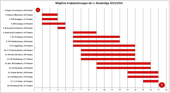 Zwischen Platz 6 und Platz 9: Punktverlust um Punktverlust gilt es Woche für Woche zu verschmerzen. Dennoch sieht die Ausgangsposition für Eintracht Frankfurt immer besser aus. Zwei Spieltage sieht es stark nach Europapokal im nächsten Jahr aus. Nur der Wettbewerb scheint noch nicht klar zu sein. Während der erste und letzte Platz bereits fix vergeben ist, ist die Range bei einigen Klubs noch ziemlich groß.