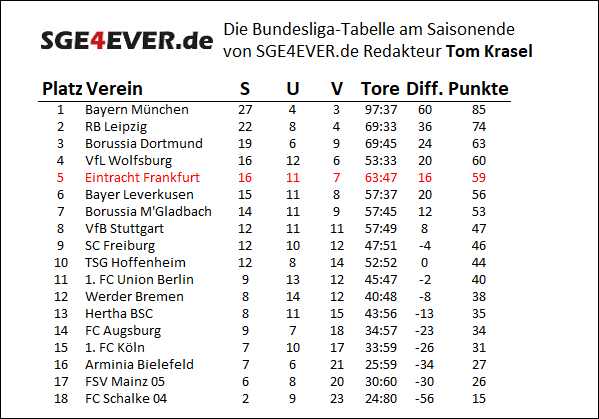 SGE4EVER.de tippt den Saisonabschluss: Bereits in der vergangenen Woche tippte der erste Redakteur von SGE4EVER.de den Saisonabschluss der Bundesliga. In dieser Woche verrät uns Redakteur Tom Krasel, wie das Saisonende aussehen wird. Seiner Prognose zufolge wird Eintracht Frankfurt in der kommenden Saison als 5. in der Gruppenphase der Europa-League an den Start gehen und damit nicht die Champions-League-Hymne im heimischen Stadion erklingen lassen. Bei den Nachbarn aus Mainz prognostiziert er zudem den direkten Abstieg.