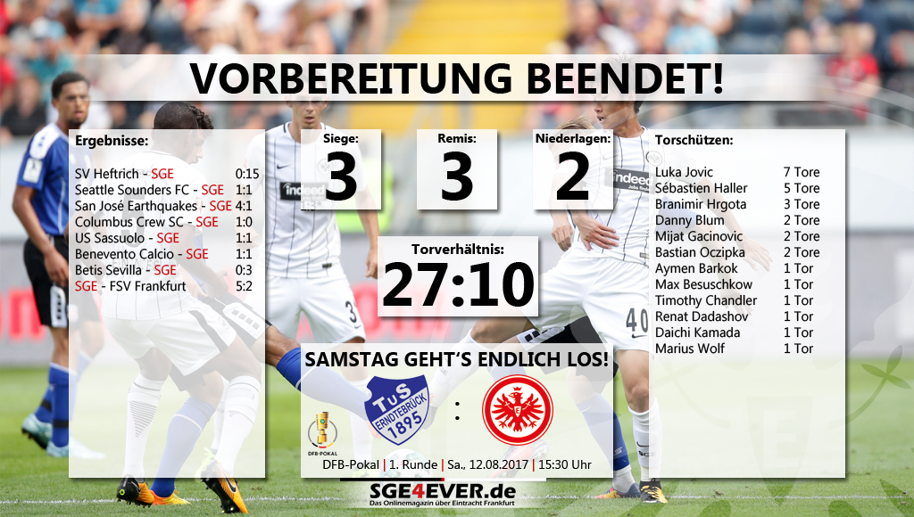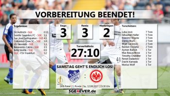 Vorbereitung nähert sich dem Ende: Am Samstag startet mit dem Hauptrunden-Spiel im DFB-Pokal das erste Pflichtspiel für Eintracht Frankfurt in der Saison 2017/2018. Damit gehen gut sieben Wochen Vorbereitungszeit, in denen man acht Testspiele austrug, zu Ende. In unserer traditionellen Übersicht lassen wir Euch noch einmal die vergangenen Wochen Revue passieren lassen.