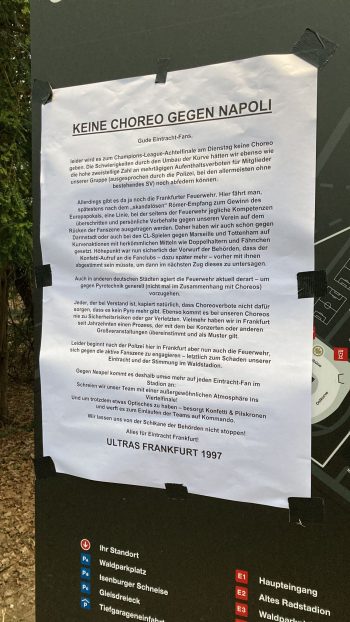 Aufruf an Fans: Wie die Ultras Frankfurt am Rande der Partie gegen Werder Bremen mitteilten, wird es im Champions-League-Achtelfinal-Hinspiel gegen den SSC Neapel keine Choreo geben. In dem Rundschreiben kritisieren die Ultras die Frankfurter Feuerwehr. Demnach hätten die Behörden bemängelt, dass ein Konfetti-Aufruf an die Fanclubs mit ihnen hätte abgestimmt werden müssen, nur um diese anschließend zu verbieten. Deshalb sollen Fans nun Konfetti und Pilskronen mitbringen, um diese beim Einlaufen der Spieler auf Kommando hochzuwerfen.