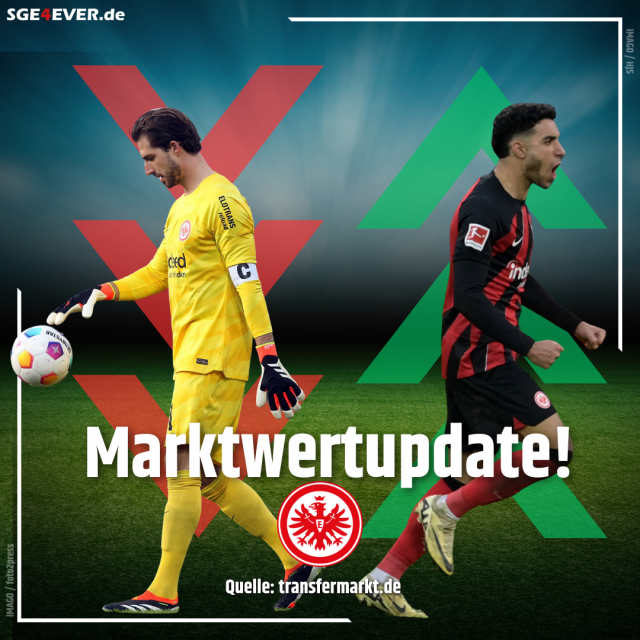 Neue Marktwerte: Die Online-Fußballdatenbank „transfermarkt.de“ hat im Rahmen eines Marktwertupdates in der Bundesliga etliche Spieler neu bewertet. Auch einige Akteure bei Eintracht Frankfurt wurden dabei berücksichtigt. Insgesamt steigt der Marktwert der SGE um etwa neun Millionen Euro auf nun 240 Millionen Euro. Der größte Marktwertverlierer bei der SGE ist Sasa Kalajdzic, der aufgrund seines Kreuzbandrisses wohl kein Spiel mir für die Hessen bestreiten wird und lange wieder in England weilt. Sein Wert fiel von elf auf nunmehr fünf Millionen Euro. Aber auch Kevin Trapp musste Federn lassen: Von sieben Millionen fiel der nicht berücksichtigte Nationalspieler auf ebenfalls fünf Millionen Euro. Tuta fiel ebenfalls dem Marktwertupdate zum Opfer. Von seinem Karrierehöchstwert von 15 Millionen Euro fiel er auf nunmehr zwölf Millionen. Neuzugang Donny van de Beek büßte zwei Millionen auf nun sieben Millionen Euro ein. Aber es gab auch mehrere Gewinner bei der SGE. Willian Pacho verbuchte ein Plus von sechs Millionen Euro und ist mit insgesamt 30 Millionen Euro nun wertvollster Adlerträger. Der größte Gewinner ist allerdings Omar Marmoush. Der Top-Scorer der Hessen legte um saftige sieben Millionen Euro an Marktwert zu (das ist mehr, als er an Marktwert hatte, als er zur Eintracht wechselte) und ist jetzt 22 Millionen Euro wert. Auch Fares Chaibi (von 15 auf 18 Millionen), Ansgar Knauff (von acht auf zehn Millionen Euro) und Niels Nkounkou (von sechs auf 7,5 Millionen) steigerten ihre Marktwerte.