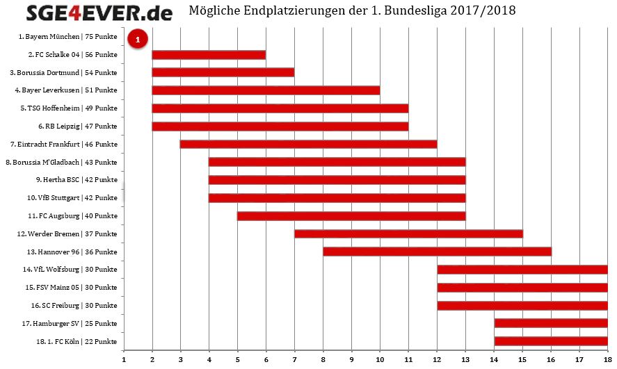 SGE4EVER.de zeigt potenzielle Endplatzierungen: Platz 2 ist für Eintracht Frankfurt in dieser Saison nicht mehr möglich. Dennoch bleibt der Kampf um die internationalen Plätze weiter heiß umkämpft. Hamburg (1:0) und Köln (2:2) konnten mit ihren Punktgewinnen am Wochenende noch einmal ihren Kopf aus der Schlinge ziehen und verbleiben mit einer kleinen Rest-Hoffnung am kommenden Spieltag weiterhin Erstligist.