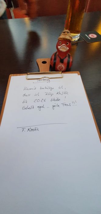 Kurioses Kostic-Angebot: Unterschriftsreif lag er vor ihm, doch Filip Kostic wollte nicht unterschreiben. „Hiermit bestätige ich, dass ich Filip Kostic bis 2026 bleibe. Gehalt egal – geile Fans!“, hieß es auf dem handschriftlich gefertigten Vertrag, den Eintracht-Anhänger beim Fanabend ihrem Idol vorlegten. „Nein, nein“, winkte der lachend ab. Eintracht-Fan Ralf Bender lachend über die Aktion: „Mist, er hat verstanden, was er unterschreiben soll. Aber ein Versuch war es wert.“ Auch so hatten die Fans zum Abschluss des Trainingslagers in entspannter Atmosphäre im Golfclub Dilly ihren Spaß und konnten ihre Idole einmal näher kennenlernen. Und was nicht ist, kann ja noch werden.